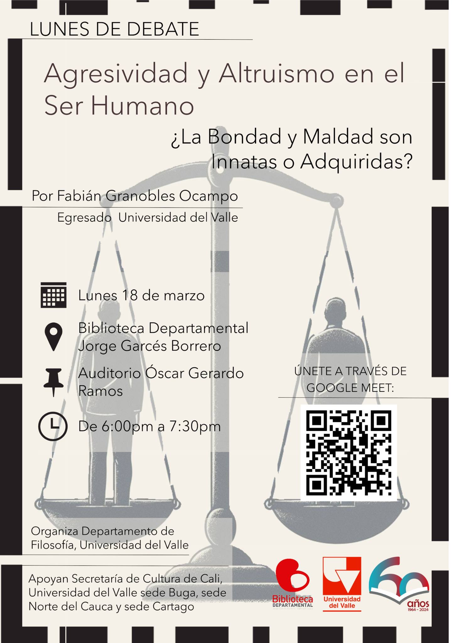 Invitamos a la comunidad en general a participar en el programa de extensión del Departamento de Filosofía de la Facultad de Humanidades de la Universidad del Valle "Lunes de Debate. Filosofía en la Ciudad".