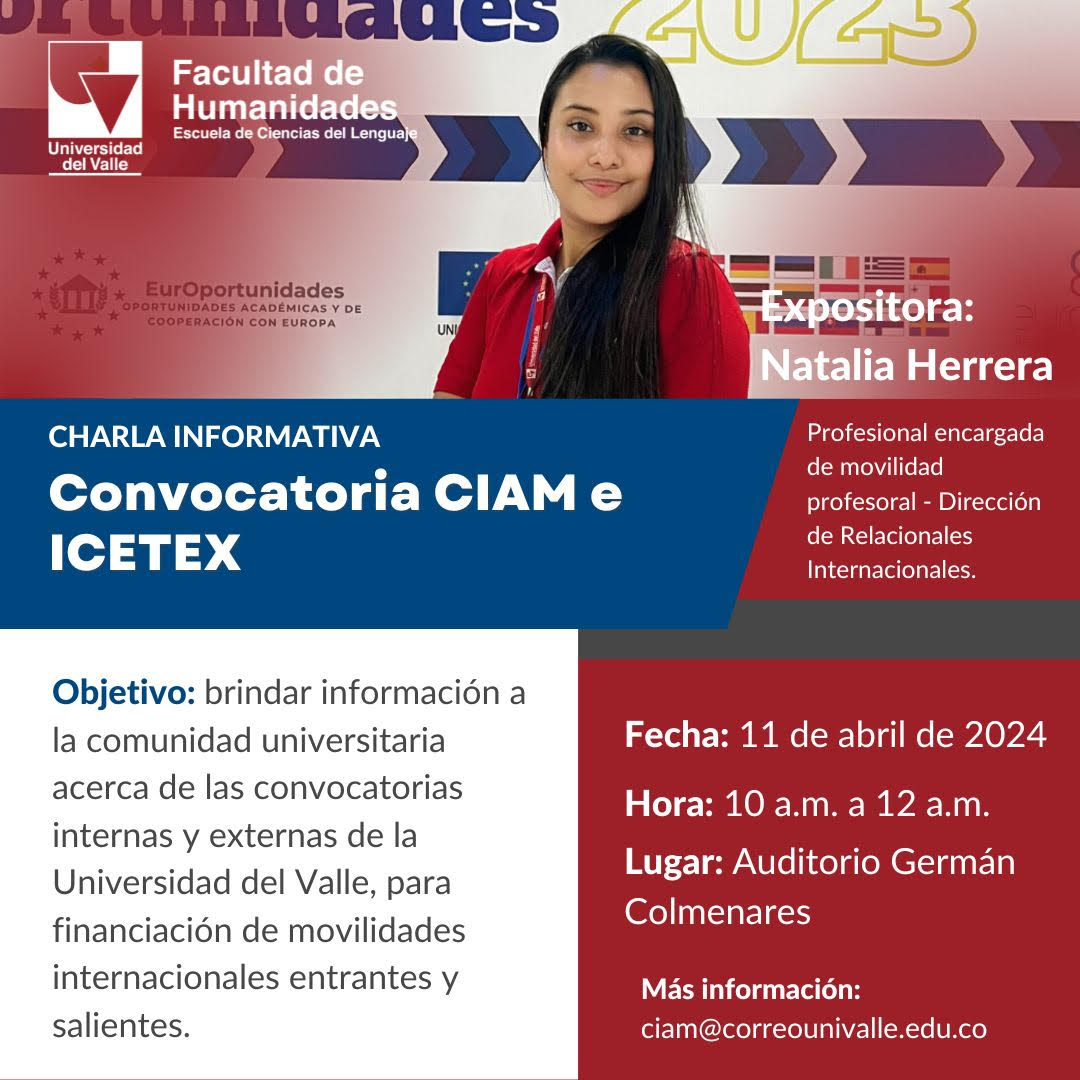 La Escuela de Ciencias del Lenguaje de la Facultad de Humanidades de la Universidad del Valle ha coordinado con la Dirección de Relaciones Internacionales se ha coordinad una charla informativa para docentes y estudiantes de posgrado sobre las convocatorias de movilidad entrante y saliente a través de la CIAM o por programas con el ICETEX. Será un espacio abierto a todos para conocer estas oportunidades y aclarar dudas.