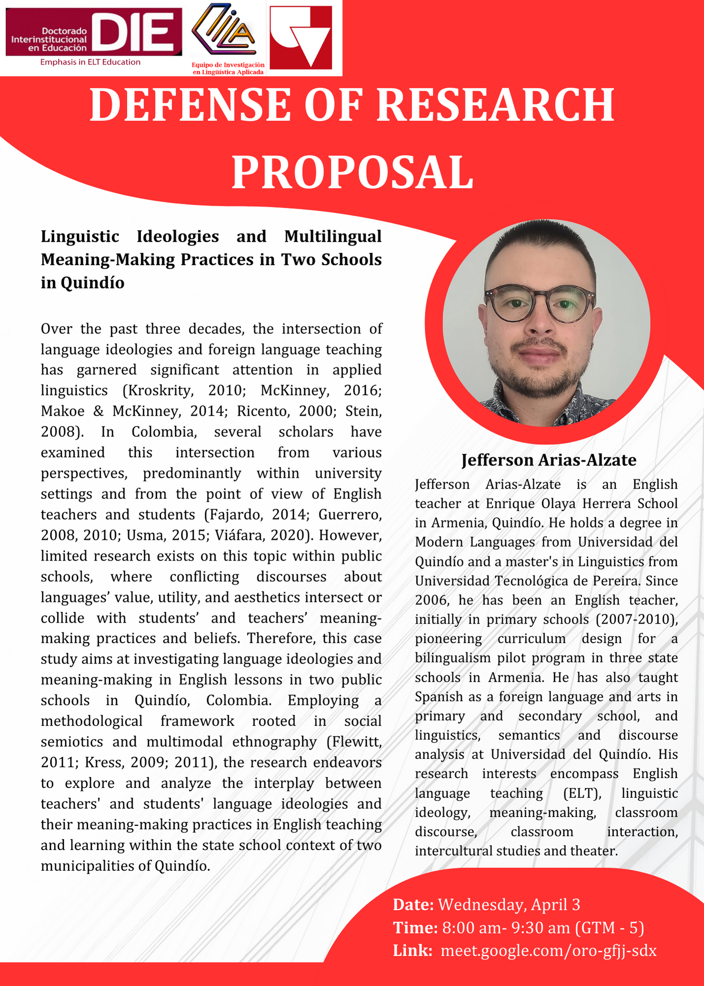El Énfasis en ELT del Doctorado Interinstitucional en Educación invita cordialmente a la defensa oral de la propuesta de investigación "Linguistic ideologies and multilingual meaning-making practices in two schools in Quindío", presentada por Jefferson Arias.