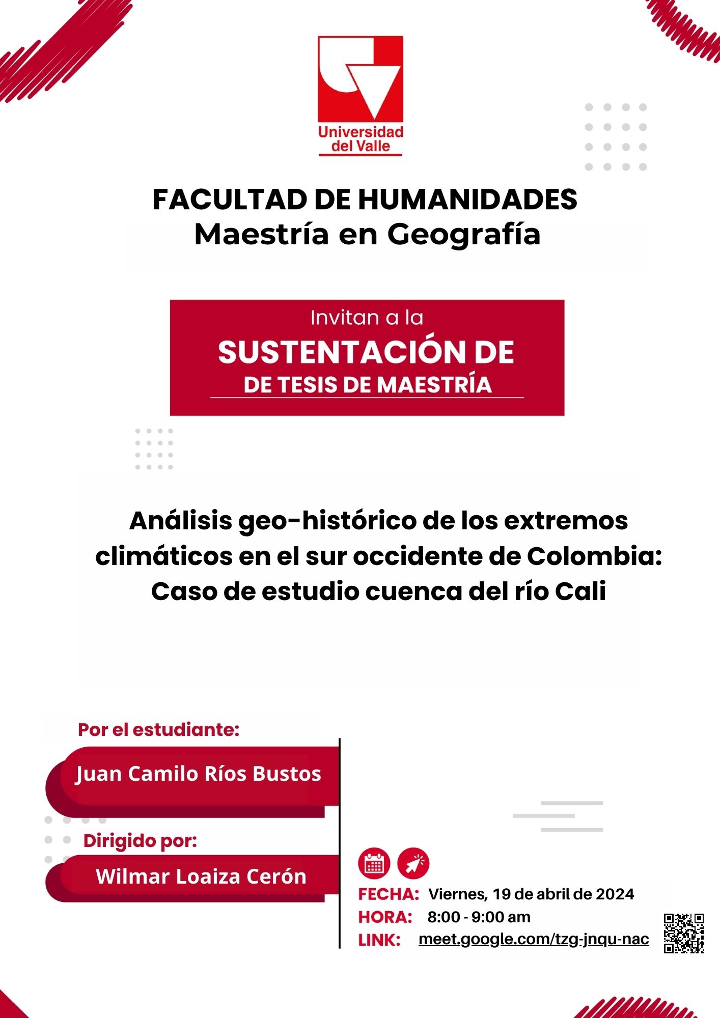 La Maestría en Geografía de la Universidad del Valle se complace en extenderles la invitación a la sustentación pública de tesis de su maestrante e historiador Juan Camilo Ríos Bustos, de la cohorte 2020.