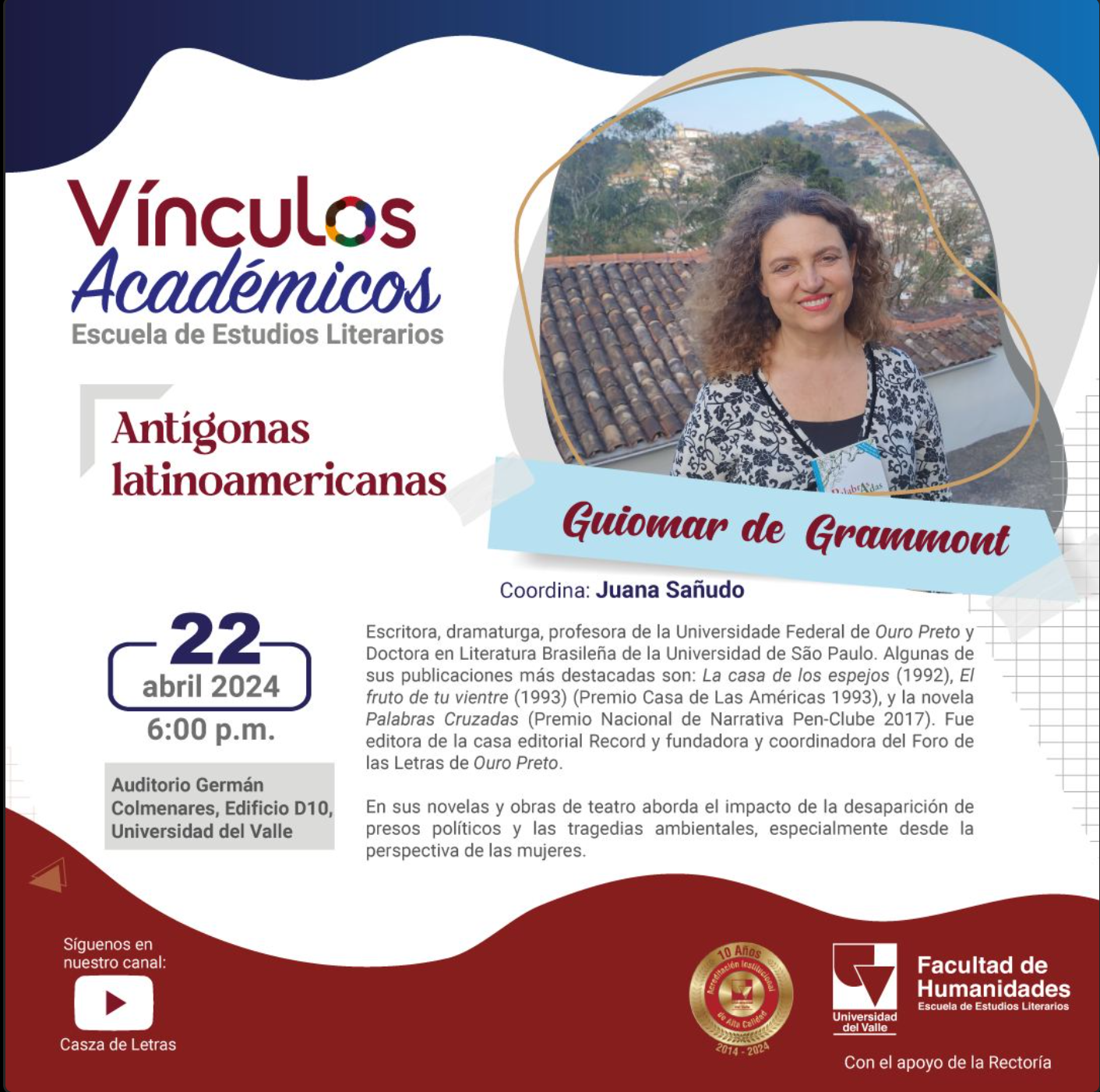 La Escuela de Estudios Literarios de la Facultad de Humanidades de la Universidad del Valle tiene el agrado de invitar a la conferencia Antígonas latinoamericanas, la cual aborda la obra "Palabras Cruzadas" (2017) de la autora e invitada Guiomar de Grammont. Este evento se encuentra dentro del marco de Vínculos Académicos, el nuevo programa de extensión de la Escuela de Estudios Literarios que cuenta con el apoyo de la Rectoría. La presentación y coordinación estarán a cargo de Juana Sañudo. ¡Les esperamos!