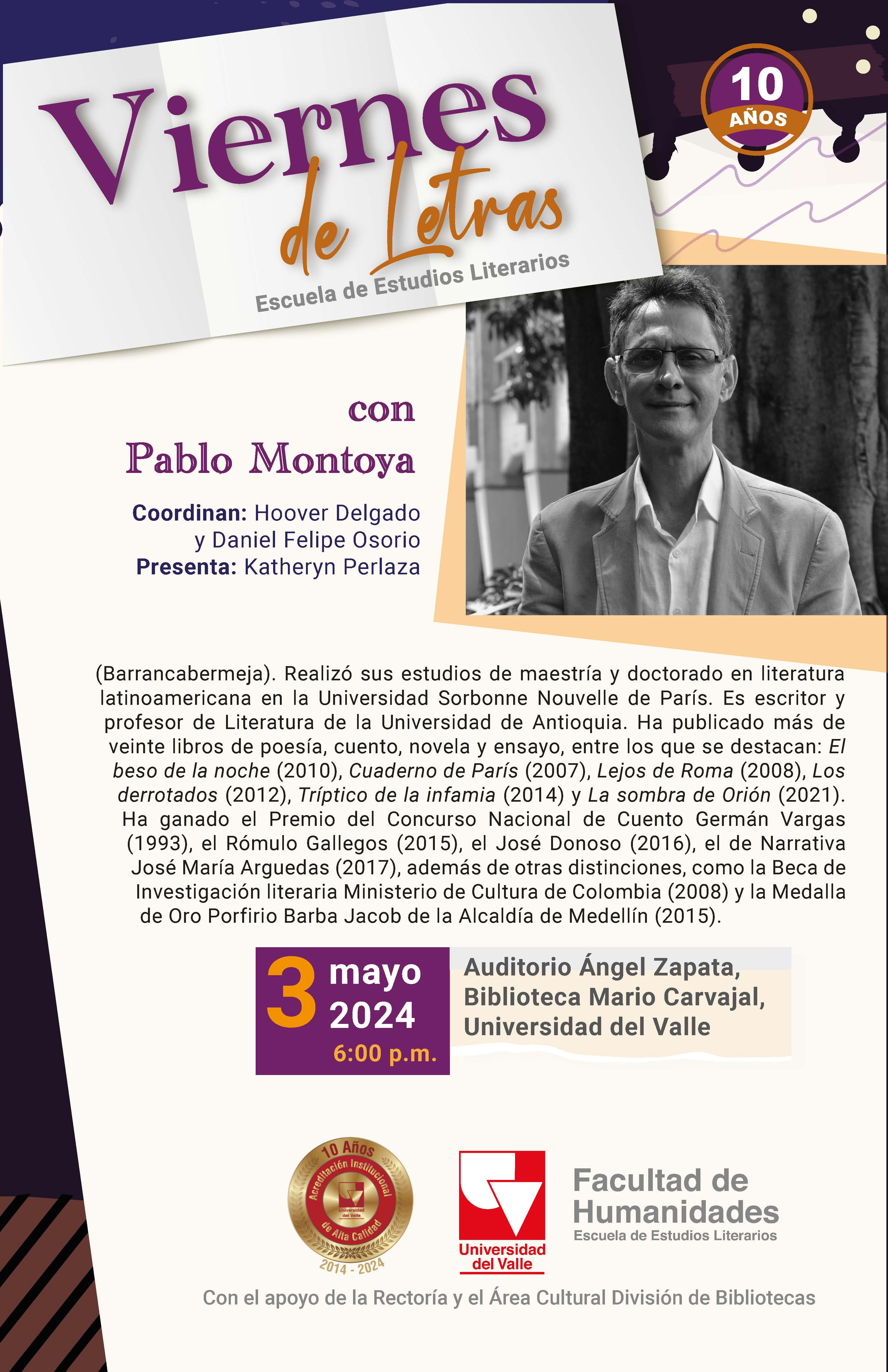 La Escuela de Estudios Literarios de la Facultad de Humanidades de la Universidad del Valle tiene el agrado de invitar al conversatorio con el escritor y profesor de literatura, Pablo Montoya. El evento será coordinado por Hoover Delgado y Daniel Felipe Osorio. La presentación del invitado estará a cargo de la estudiante Katheryn Perlaza. Este será el sexto invitado del décimo aniversario de Viernes de Letras, programa de extensión de nuestra unidad académica que cuenta con el apoyo de la Rectoría y el Área Cultural División de Bibliotecas.