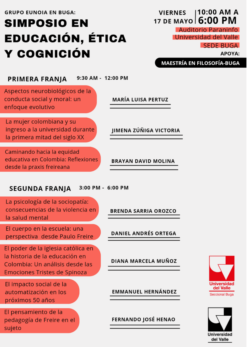 Nos complace invitarlos al Simposio en Educación, Ética y Cognición, organizado por el Grupo de Investigación Eunoia y con el apoyo de la Maestría en Filosofía de la Facultad de Humanidades de la Universidad del Valle, sede Buga. Este simposio es parte de una serie de eventos en modalidad híbrida cuya organización inició como parte del proyecto de investigación "Cognición, emociones y gramática". Este tiene como objetivo principal divulgar los avances investigación de los estudiantes que trabajan en la línea de investigación "Educación, Ética y Cognición" del grupo Eunoia.