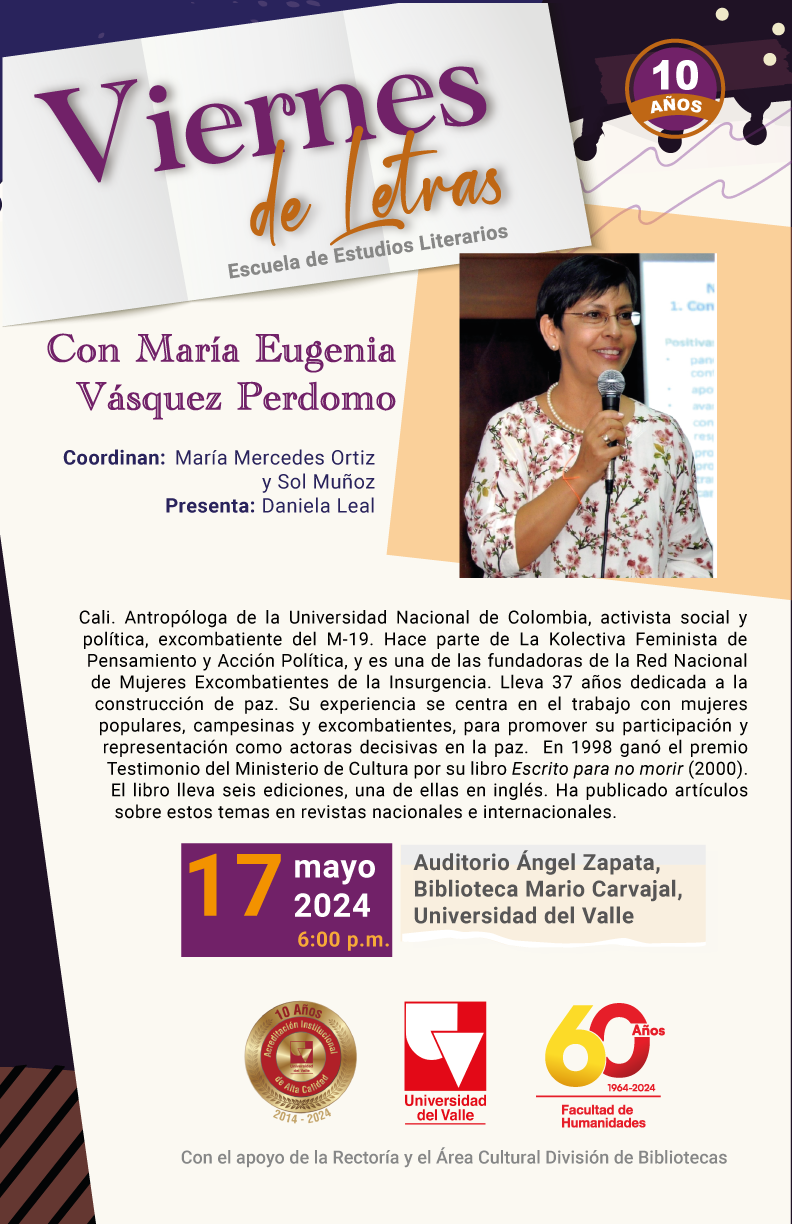 La Escuela de Estudios Literarios de la Universidad del Valle tiene el agrado de invitar al conversatorio con la escritora y activista social, María Eugenia Vásquez. El evento será coordinado por María Mercedes Ortiz y Sol Muñoz. La presentación de la invitada estará a cargo de la estudiante Daniela Leal. Este es el octavo invitado del décimo aniversario de Viernes de Letras, programa de extensión de nuestra unidad académica que cuenta con el apoyo de la Rectoría y el Área Cultural División de Bibliotecas.