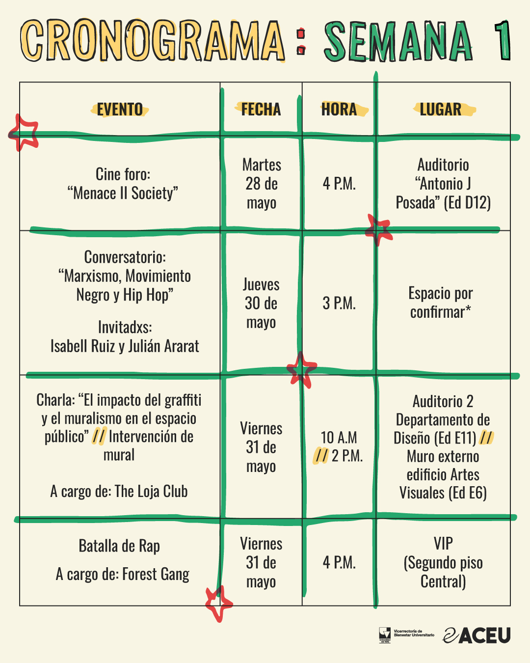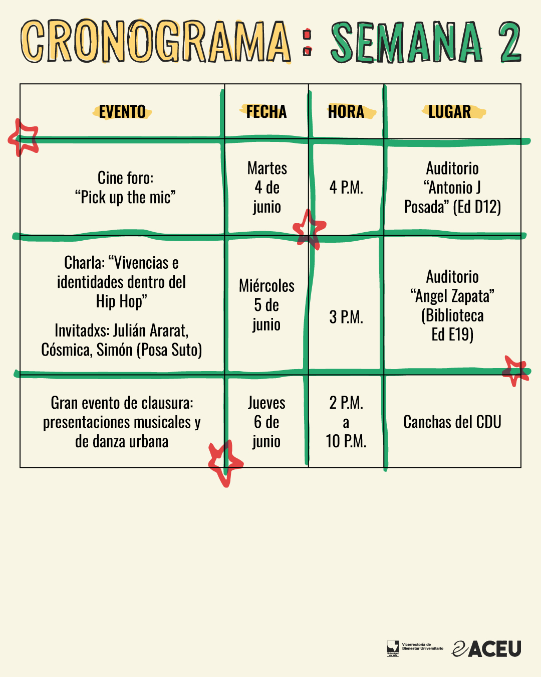 Desde la Asociación Colombiana de Estudiantes Universitarios - ACEU presentes en la Universidad del Valle hemos venido organizando con apoyo de la Vicerrectoría de Bienestar Universitario el evento Festival Hip-Hop al Campus que se realizará del 28 de mayo al 6 de junio. Extendemos la invitación a participar a toda la Facultad de Humanidades de la distintas actividades que hemos programado.