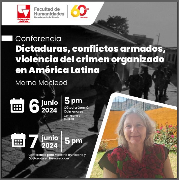 El Departamento de Historia, la Maestría en Historia y el Doctorado en Humanidades de la Facultad de Humanidades de la Universidad del Valle invitan cordialmente a la conferencia Dictaduras, conflictos armados, violencia del crimen organizado en América Latina. Esta será dictada por Morna Macleod, Maestra y Doctora en Estudios Latinoamericanos de la Universidad Nacional Autónoma de México (UNAM). Se ofrecerá en dos ocasiones, el jueves 05 de junio a las 5 p.m. en el Auditorio Germán Colmenares con entreda libre para el público general. Y el viernes 06 de junio a las 5 p.m. en el Auditorio Germán Colmenares para las persona que hacen parte de la Maestría en Historia y el Doctorado en Humanidades. ¡Les esperamos!