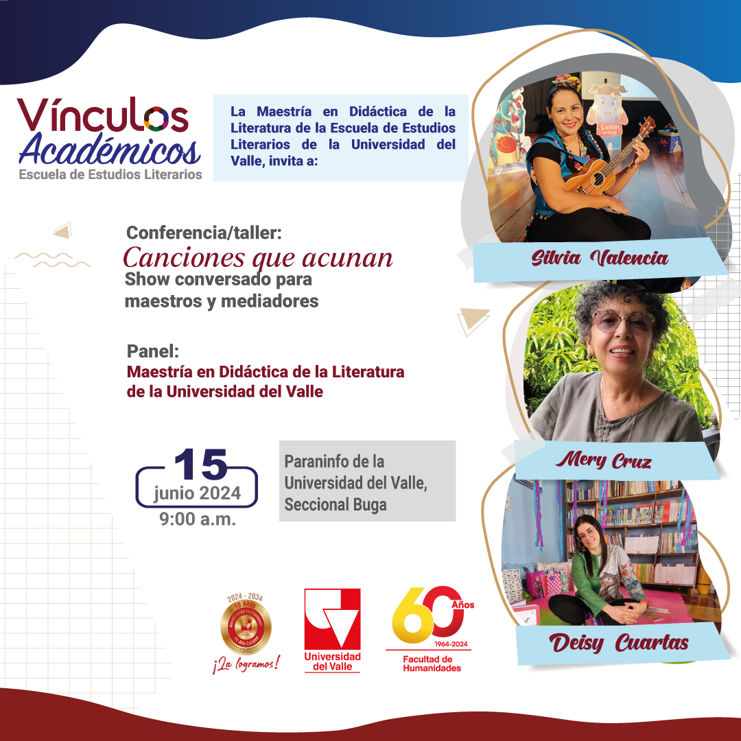 La Universidad del Valle, seccional Buga, los invita al evento de la Maestría en Didáctica de la Literatura para los(as) interesados(as), profesionales, profesores, egresados, entre otros, a realizarse el día sábado 15 de junio desde las 9 a.m. en las instalaciones de nuestra seccional. Es para nosotros un gusto invitarles a participar de este evento que busca reconocer la importancia de su participación como interesado(a) en este programa de postgrado, y en sus posibilidades de desarrollo investigativo en educación literaria, pedagogía y didáctica.