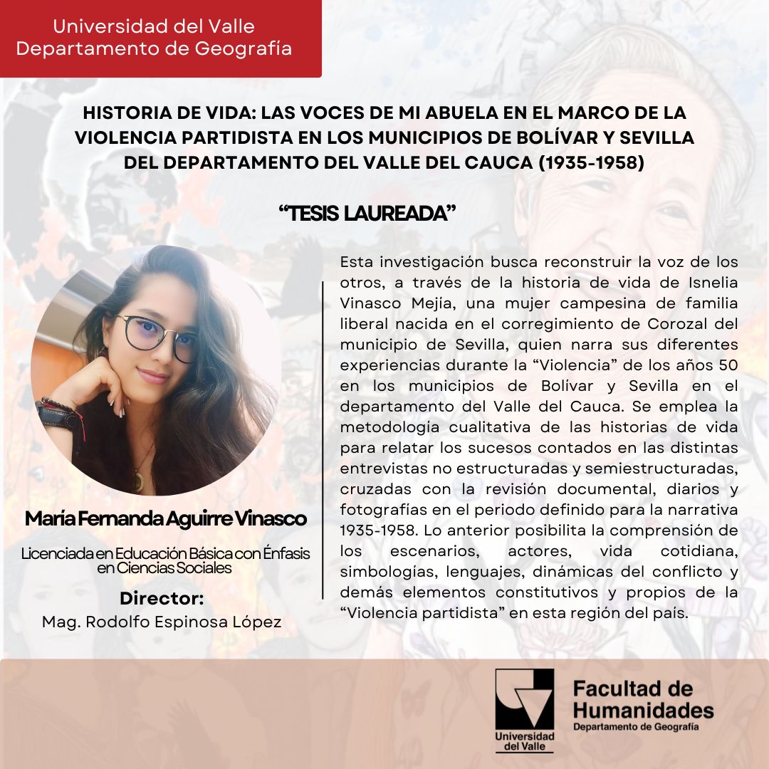 Dentro de las satisfacciones que dejó el semestre que recién termina, en el ámbito de la Licenciatura en Educación Básica en Ciencias Sociales del Departamento de Geografía, fue la consolidación del trabajo de grado “Historias de vida: las voces de mi abuela en el marco de la violencia partidista en los municipios de Bolívar y Sevilla del Departamento del Valle del Cauca” de la estudiante María Fernanda Aguirre Vinasco. El trabajo de grado fue dirigido por el profesor Rodolfo Espinoza López y logró la mención de “Tesis laureada”, gracias a las positivas apreciaciones de los jurados.