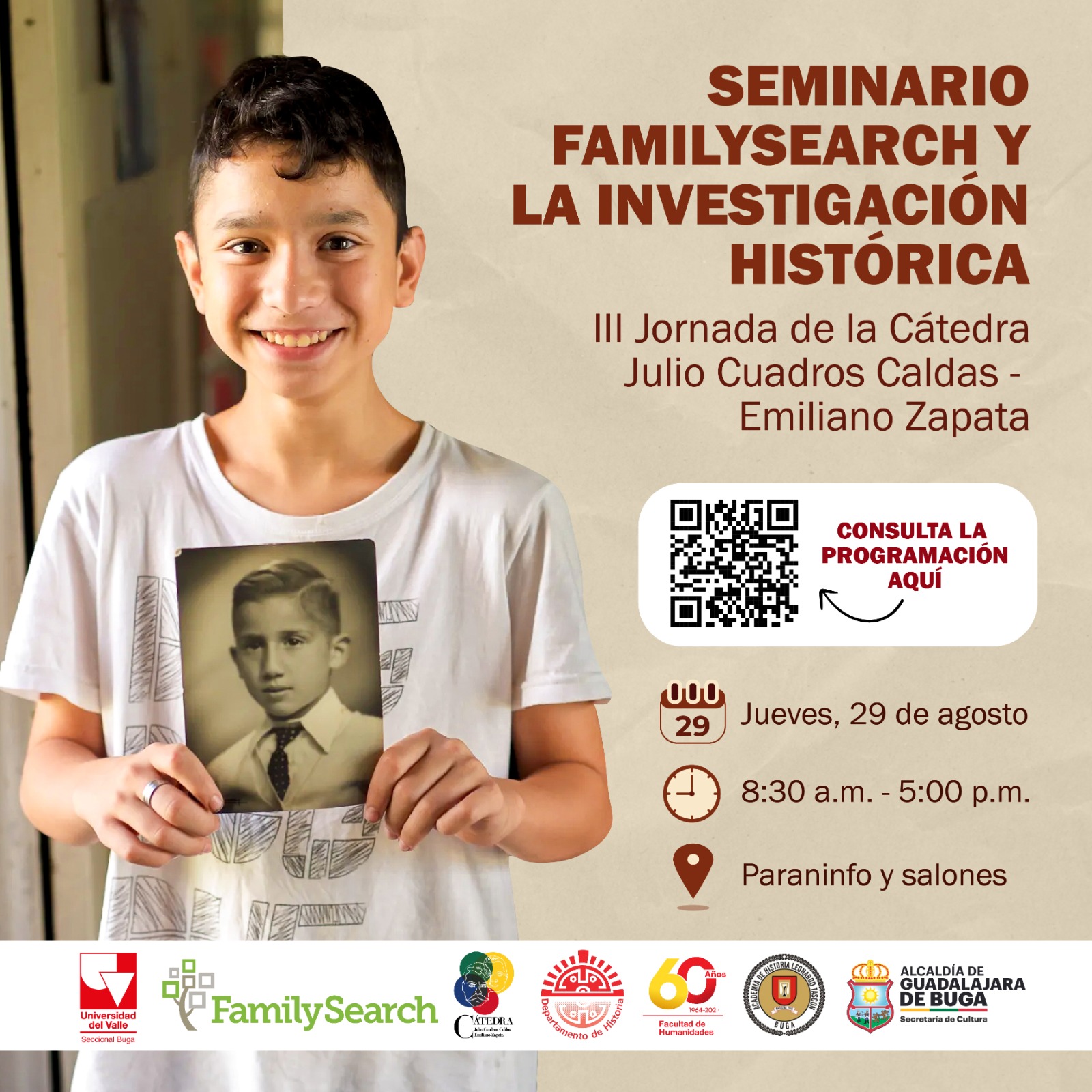 El Departamento de Historia de la Facultad de Humanidades, la sede Buga de la Universidad del Valle, la Alcaldía de Guadalajara de Buga, la organización FamilySearch y la Cátedra Julio Cuadros Caldas-Emiliano Zapata invitan al Seminario FamilySearch y la investigación histórica. La actividad académica se llevará a cabo el 29 de agosto desde las 8:30 a.m. en el Paranifo y otros salones de la sede de Buga. La apertura del evento la realizará el profesor Carlos Alberto Murgueitio Manrique (defe del Departamento de Historia) y Moroni Spencer Hernández (ambos miembros de la Cátedra JCC-EZ) y Dulio Rafael Delgado Juárez (gerente de FamilySearch para los países bolivarianos).