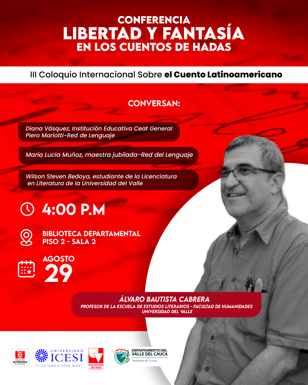 En el marco del III Coloquio Internacional Sobre el Cuento Infantil se realizará la conferencia "Libertad y Fantasía en los Cuentos de Hadas", a cargo del profesor de la Escuela de Estudios Literario de la Facultad de Humanidades Álvaro Bautista Cabrera. La conferencia se realizará la sala 2 de la Biblioteca Departamental, el 29 de agosto a las 4:00 p.m. Con el profesor conversarán Diana Vásquez (Institución Educativa Ceat General Piero Mariotti- Red de Lenguaje), María Lucía Muñoz (maestra jubilad-Red de Lenguaje) y Wilson Steven Bedoya (estudiante de la Licenciatura en Literatura de la Universidad del Valle).