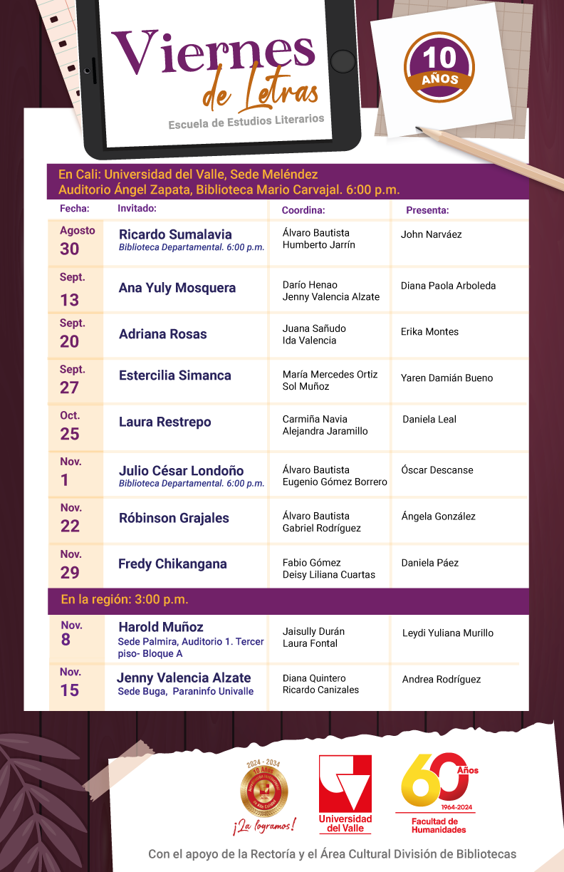 La Escuela de Estudios Literarios de la Universidad del Valle, con el apoyo financiero de la Rectoría y logístico del Área Cultural de la División de Bibliotecas, está celebrando este 2024 el décimo aniversario de uno de sus más prestigiosos programas de extensión: Viernes de Letras. Durante estos nueve años nos han visitado más de 160 escritores y escritoras. Con ellos y ellas nuestra comunidad universitaria ha compartido ideas sobre la creación literaria, sus métodos y realizaciones. Para celebrar este décimo aniversario desarrollamos el semestre pasado diez conversatorios con los escritores Daniel Ferreira, Juan Miguel Álvarez, Gabriel Rodríguez, Eduard Pereira, David Betancourt, Pablo Montoya, y las escritoras Helen García Aristizábal, María Eugenia Vásquez, Diana Salinas y Verónica Peñaranda. Para completar este año de celebración, desarrollaremos durante este segundo semestre de 2024 otros diez encuentros con las escritoras Ana Yuly Mosquera, Adriana Rosas, Estercilia Simanca, Laura Restrepo, Jenny Valencia Alzate, y los escritores Ricardo Sumalavia, Julio César Londoño, Róbinson Grajales, Harold Muñoz.