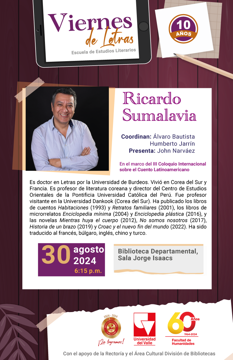 La Escuela de Estudios Literarios de la Facultad de Humanidades de la Universidad del Valle tiene el agrado de invitar al conversatorio con el escritor Ricardo Sumalavia. Este será el primer invitado de la décima temporada de Viernes de Letras, programa de extensión de nuestra unidad académica que cuenta con el apoyo del Área Cultural División de Bibliotecas y de la Rectoría de la Universidad del Valle. El evento será coordinado por los profesores Álvaro Bautista y Humberto Jarrín. La presentación del invitado estará a cargo del egresado John Narváez.