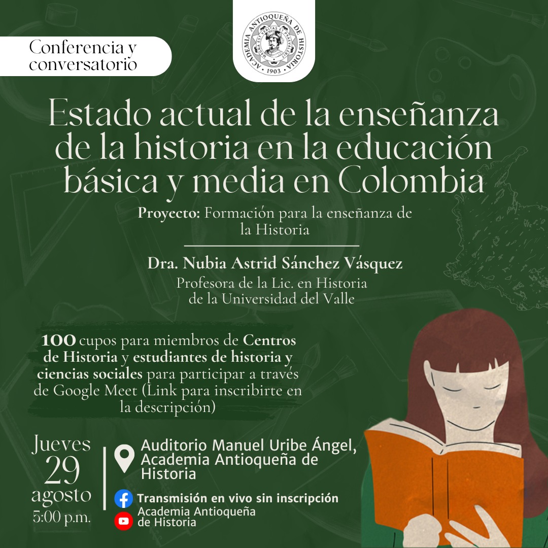La Academia Antioqueña de Historia tiene el gusto de invitarte a la conferencia y conversatorio "Estado actual de la enseñanza de la historia en la educación básica y media en Colombia" que se realizará el próximo jueves, 29 de agosto en el auditorio Manuel Uribe Ángel de la Academia Antioqueña de Historia (Cra. 43 #53-37, La Candelaria, Medellín). La conferencia estará a cargo de la profesora de la Universidad del Valle Nubia Astrid Sánchez Vásquez.