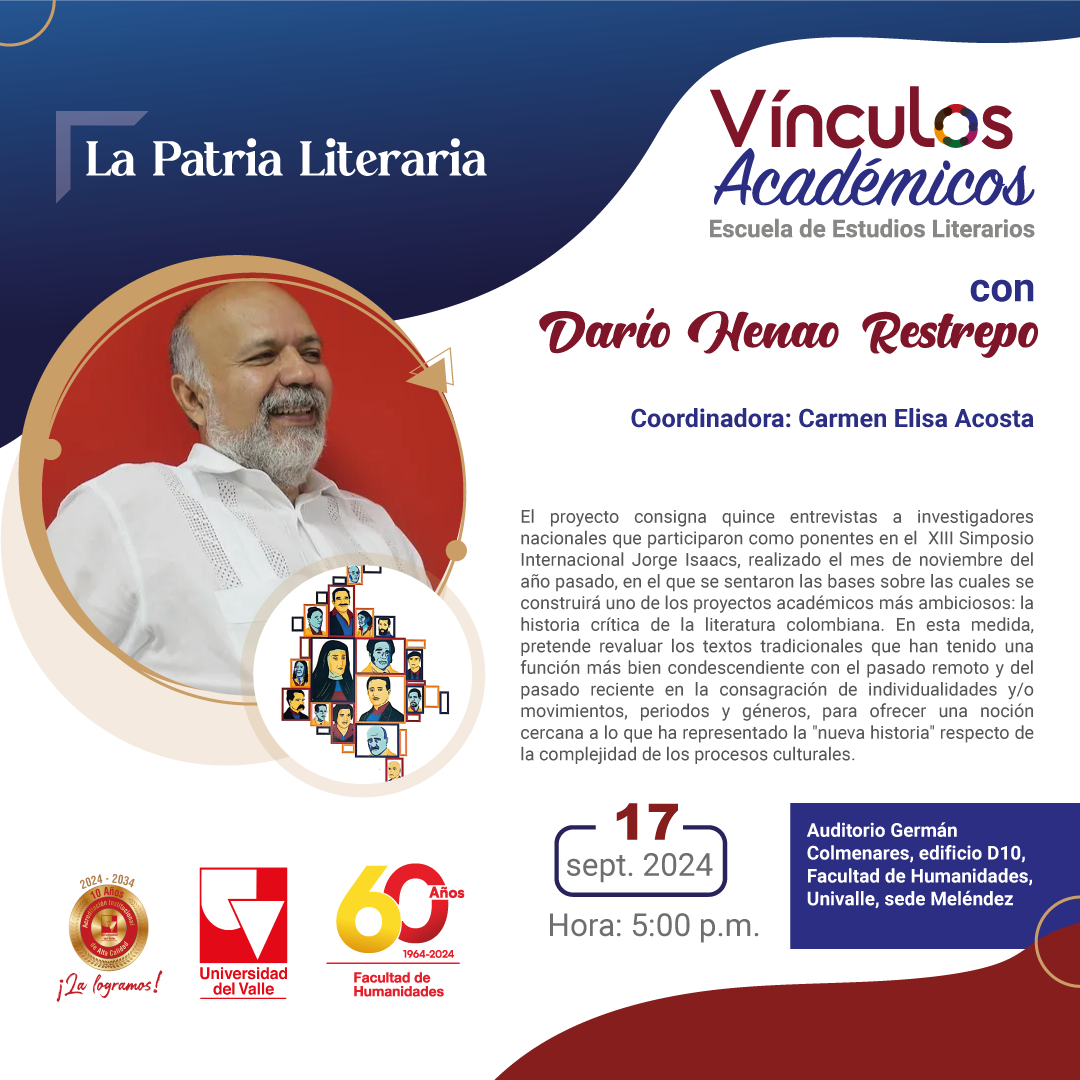 La Escuela de Estudios Literarios los invita a la conferencia La Patria Literaria del decano Darío Henao. El proyecto consigna quince entrevistas a investigadores nacionales participantes del XIII Simposio Internacional Jorge Isaacs. La presentación y coordinación estarán a cargo de Carmen Elisa Acosta, directora del Instituto Caro y Cuervo.