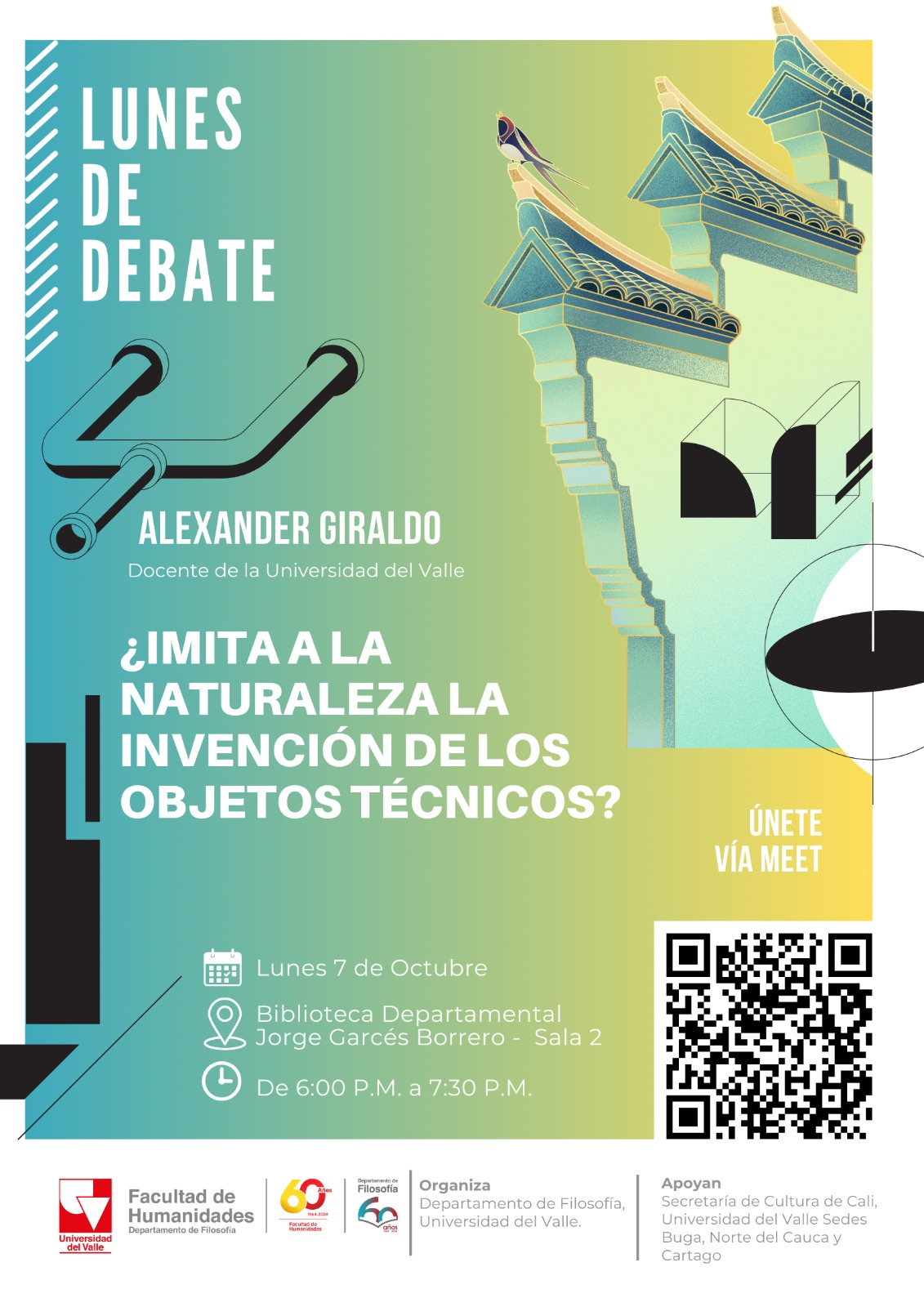 Invitamos a la comunidad en general a participar en el programa de extensión del Departamento de Filosofía de la Facultad de Humanidades de la Universidad del Valle "Lunes de Debate. Filosofía en la Ciudad". Para el 7 de octubre se presentará la conferencia "¿Imita a la naturaleza la invención de los objetos técnicos?", a cargo del docente del Departamento de Filosofía Alexander Giraldo. La actividad se realizará en la Sala 2 de la Biblioteca Departamental Jorge Garcés Borrero, de 6:00 a 7:30 p.m. Transmisión vía Meet (Ingresar por medio del código QR)