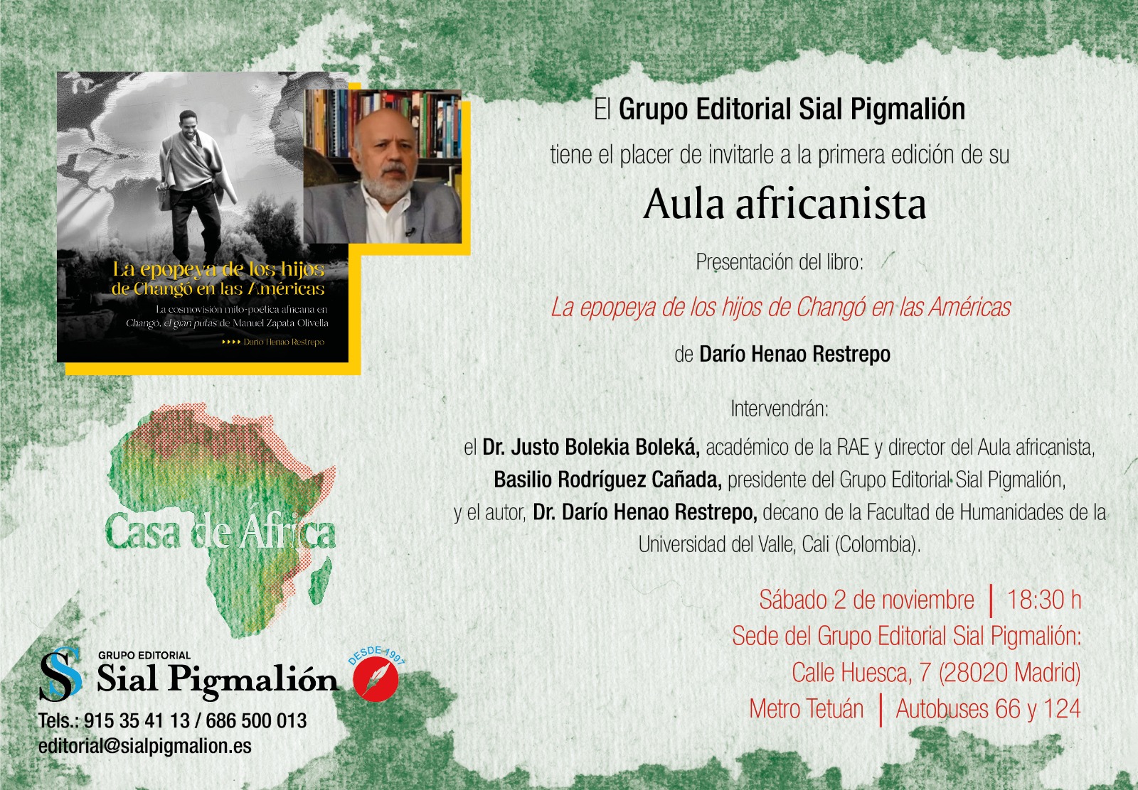 El Grupo Editorial Sial Pigmalión, en el marco de su Aula Africanista, ha invitado al académico Justo Bolekia Boleká (director de Aula Africanista) y al presidente de este grupo editorial Basilio Rodríguez Cañada a acompañar la presentación del escritor. La actividad se realizará en la ciudad de Madrid el próximo 2 de noviembre.