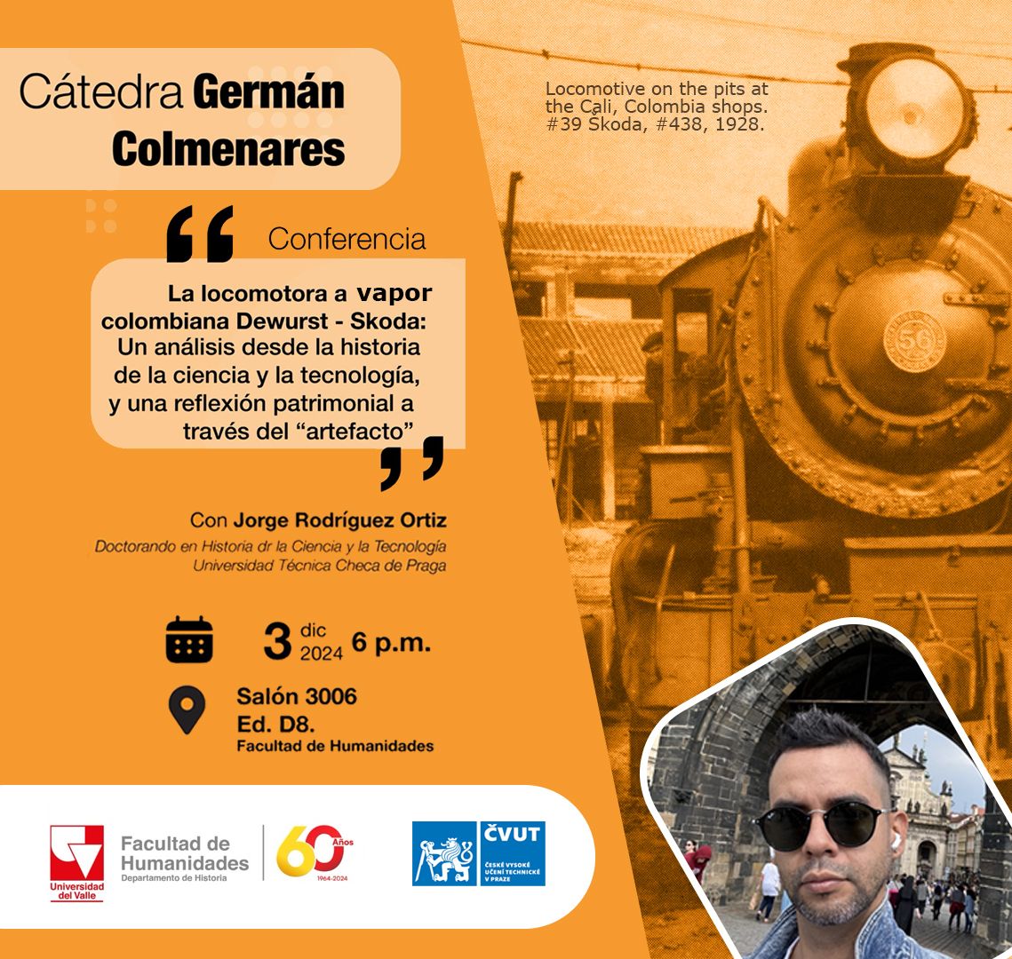La Cátedra Germán Colmenares del Departamento de Historia de la Facultad de Humanidades invita a la conferencia "La locomotora a vapor colombiana Dewurst-Skoda: un análisis desde la historia de la ciencia y la tecnología, y una reflexión patrimonial a través del "artefacto"", a cargo de Jorge Rodríguez Ortiz (Doctorando en Historia de la Ciencia y la Tecnología - Universidad Técnica Checa de Praga). La actividad académica se desarrollará el 3 de diciembre a las 6:00 p.m. en el salón 3006 del Edificio D8 (Facultad de Humanidades).