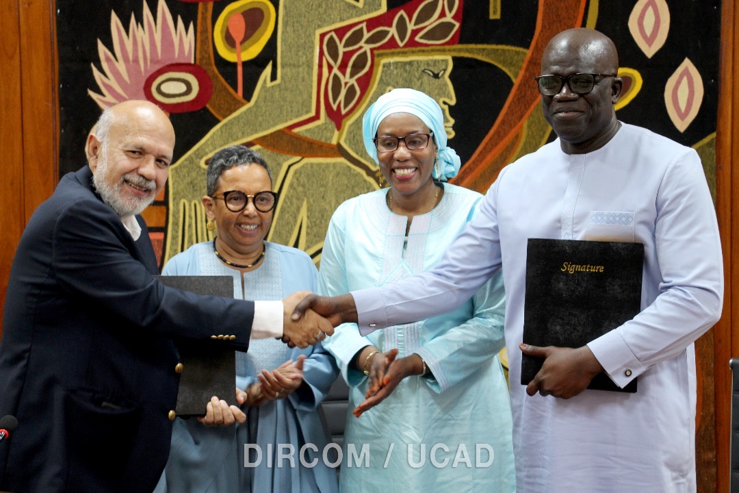 En la foto, de izquierda a derecha: Darío Henao Restrepo (Decano Facultad de Humanidades de UV), Claudia Mosquera Rosero (Embajadora de Colombia en Senegal), Aminata Niang Diéne (Rectora de la UCAD) y Alioune Badara Kandji (Decano Facultad de Letras y Ciencias Humanas de la UCAD).