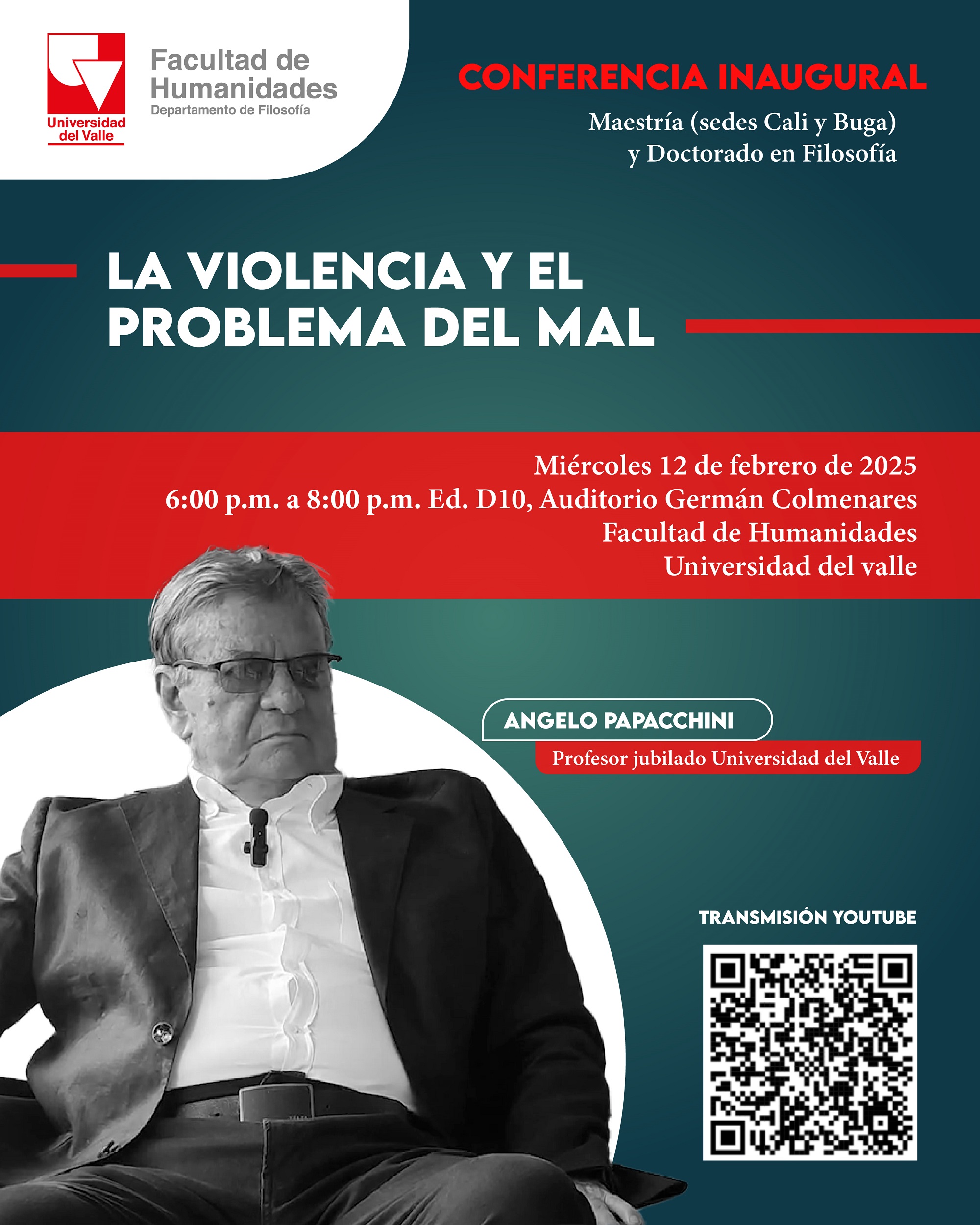 El Doctorado en Filosofía y la Maestría en Filosofía (sedes Cali y Buga) invita a la conferencia inaugural La violencia y el problema del mal, a cargo del filósofo y el profesor jubilado de la Universidad del Valle Angelo Papacchini.