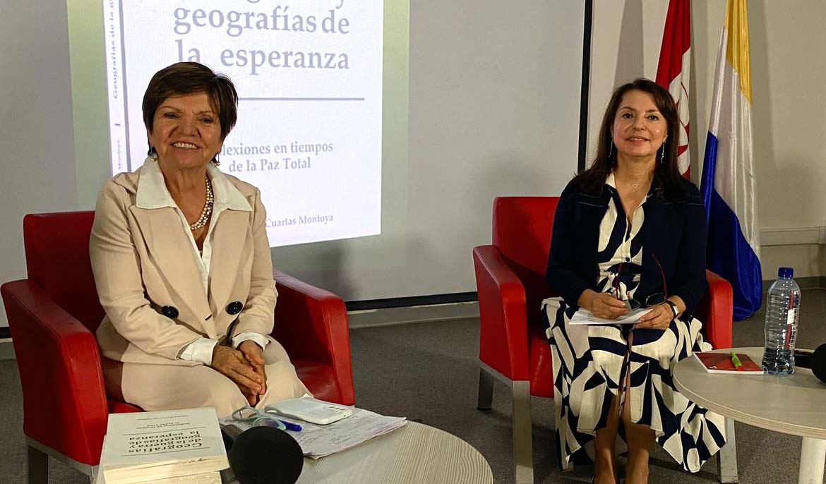 Gloria Cuartas, trabajadora social y ex alcaldesa de Apartadó, reconocida por defender la paz en esa región, participó en un diálogo con la Profesora Alba Nubia Rodríguez, explorando el rol de la geografía en los estudios para la paz. Con la presentación de su libro Geografías de la Guerra y Geografías de la Esperanza, Cuartas explicó la superposición de intereses del Urabá desde 1985 hasta el 2013. “Después de 30 años de muerte, de despojo y de eliminación de los sindicatos, nos muestran un gran puerto. Por su parte, la comunidad advirtió que valía la pena quedarse en su territorio, que valía la pena amar, estar con sus hijas, cuidar el campo. Encontramos esos dos extremos: el gran desarrollo que generó muerte y el desarrollo de una comunidad que hace una propuesta anti hegemónica”.