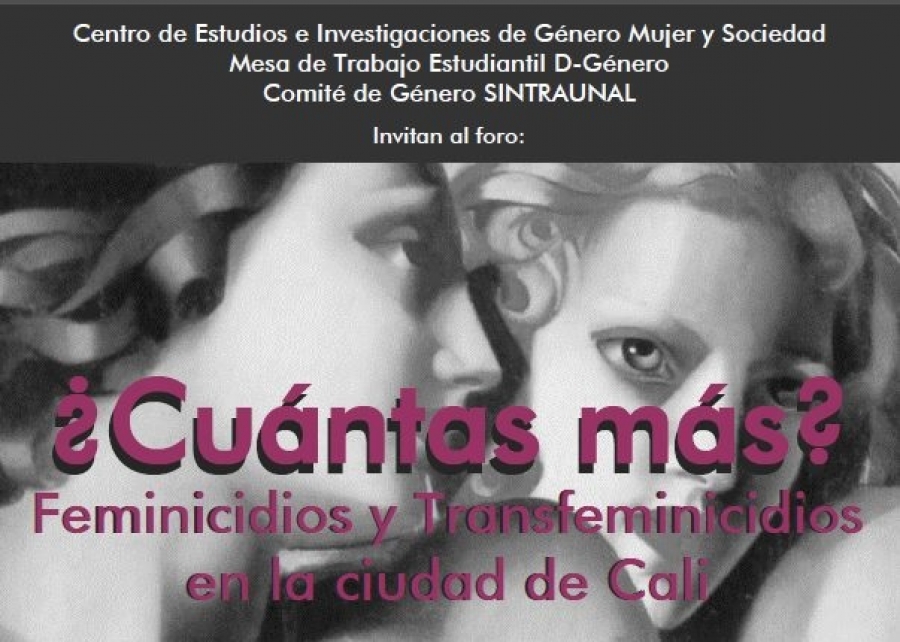 El Centro de Estudios e Investigaciones de Género Mujer y Sociedad, la Mesa de Trabajo Estudiantil D-Género y el Comité de Género SINTRAUNAL, invitan al foro: ¿Cuántas más? Feminicidios y Transfeminicidios en la ciudad de Cali, que se llevará a cabo este miércoles 8 de marzo, a las 10:00 a.m., en el auditorio Germán Colmenares, Edificio 386, Universidad del Valle, sede Meléndez.