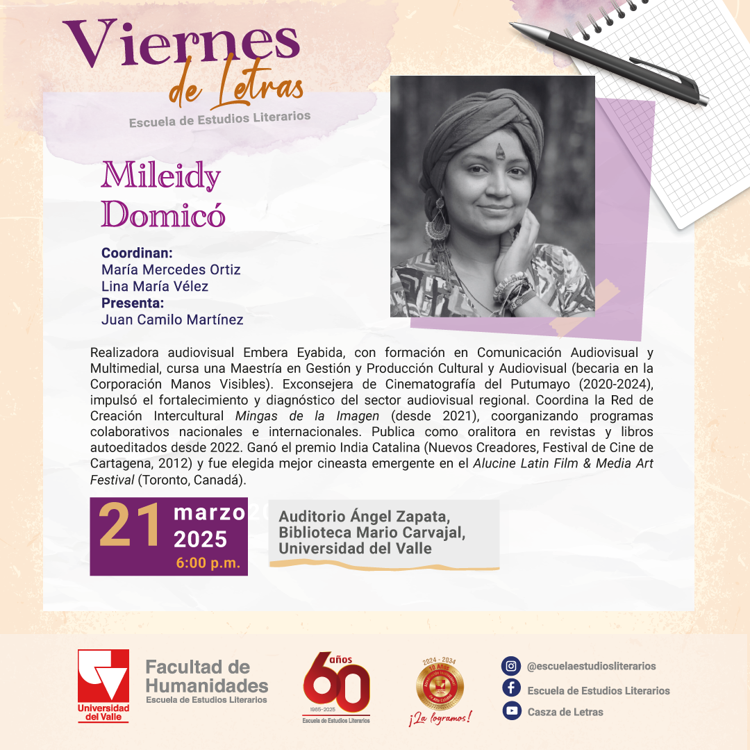 La Escuela de Estudios Literarios de la Universidad del Valle te invita a un conversatorio especial con la destacada escritora y realizadora audiovisual Mileidy Domicó.