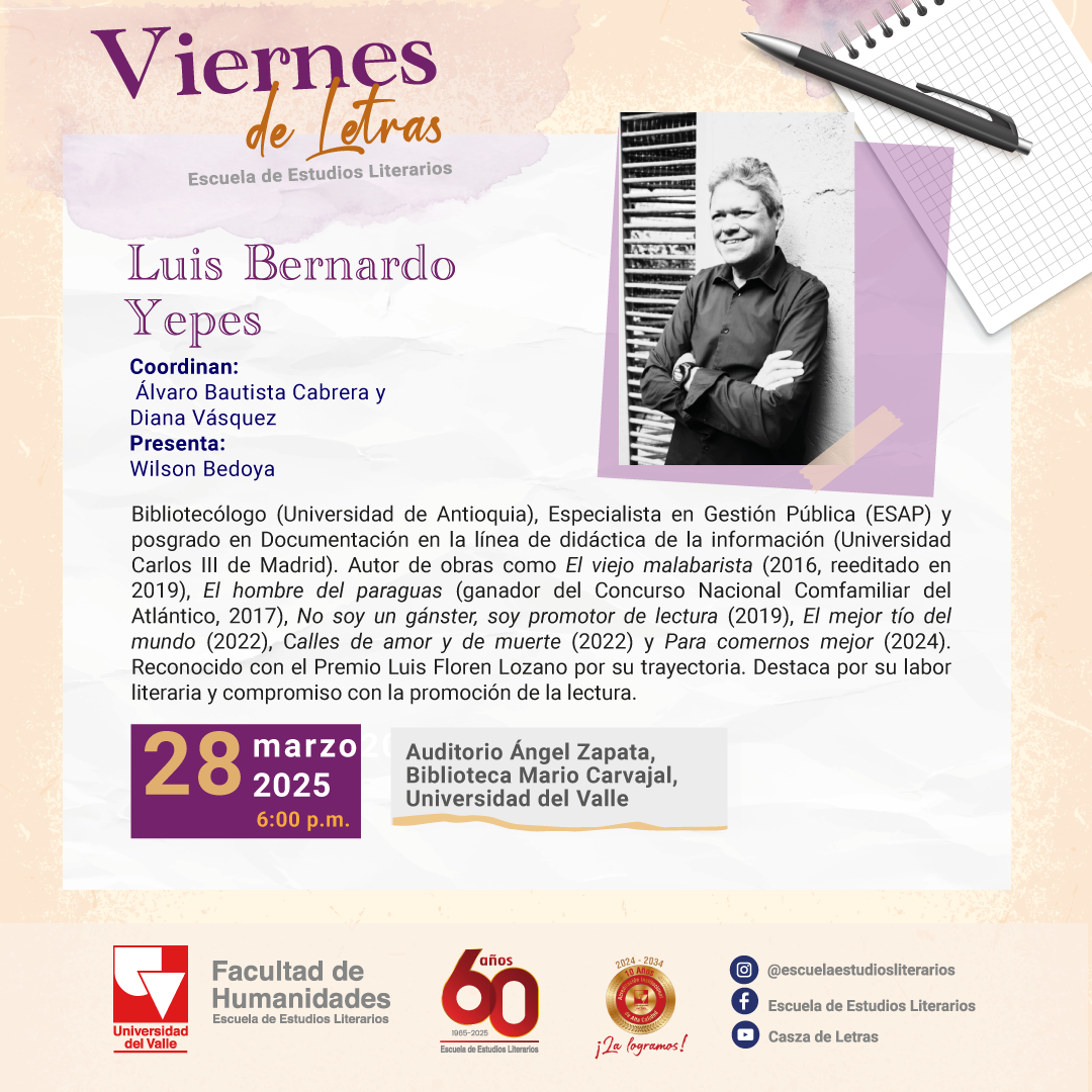 Viernes de Letras, espacio de la Escuela de Estudios Literarios, invita a la sesión del próximo 28 de marzo con el escritor Luis Bernardo Yepes. El invitado es bibliotecólogo de la Universidad de Antioquia, especialista en Gestión Pública de la ESAP y posgraduado en Documentación en línea de Didáctica de la Información de la Universidad Carlos III de Madrid. Es autor de obras como El viejo malabarista (2016, reeditado en 2019), El hombre del paraguas (ganador del Concurso Nacional Comfamiliar del Atlántico , 2017), No soy un gangster, soy promotor de lectura (2019), El mejor tío del mundo (2022), Calles de amor y de muerte (2022) y Para comernos mejor (2024). Reconocido con el Premio Luis Floren Lozano por su trayectoria. Se destaca por su labor literaria y compromiso con la promoción de lectura.