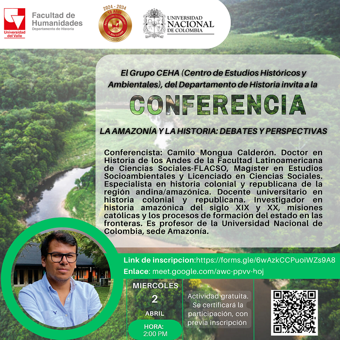 El Departamento de Historia y el Grupo CEHA (Centro de Estudios Históricos y Ambientales) de la Facultad de Humanidades invitan a la conferencia La Amazonía y la historia: debates y perspectivas. La conferencia estará a cargo del doctor Camilo Mongua Calderón (Doctor en Historia de los Andes de la FLACSO). La actividad se realizará el miércoles 2 de abril a las 2:00 p.m.
