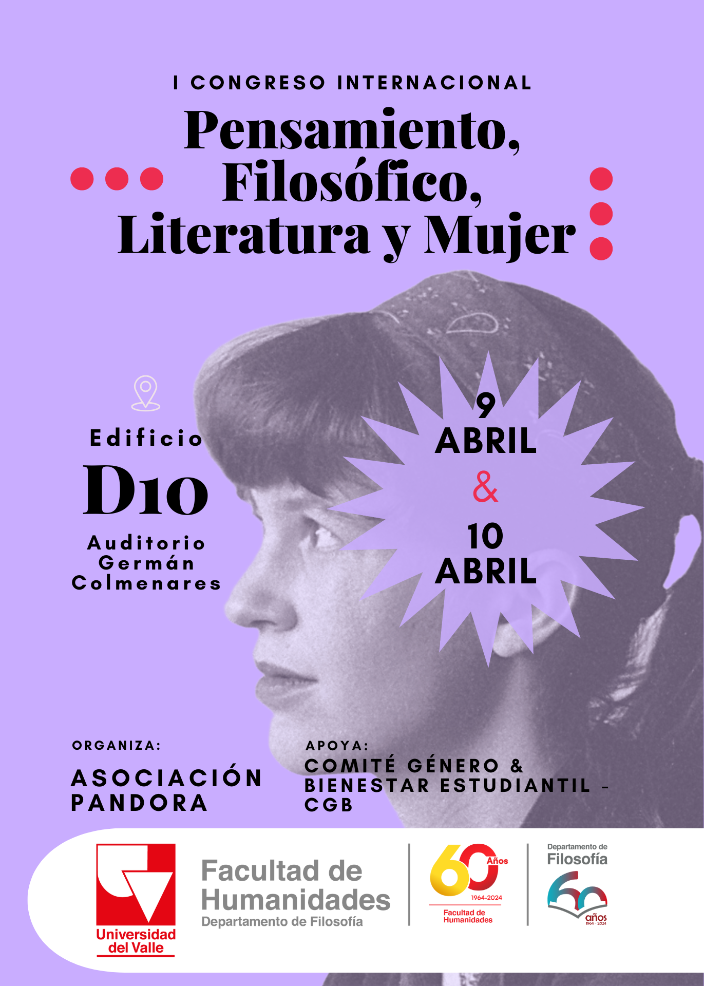 La Asociación Pandora, en colaboración con el Comité de Género y Bienestar Estudiantil del Departamento de Filosofía de la Facultad de Humanidades de la Universidad del Valle, tiene el gusto de invitarles al I Congreso Internacional Pensamiento Filosófico, Literatura y Mujer, que se llevará a cabo los días 9 y 10 de abril de 2025. Este Congreso tiene como propósito abrir un espacio de reflexión e intercambio académico en torno a las intersecciones entre el pensamiento filosófico, la literatura y las perspectivas de género. Será una oportunidad para dialogar y enriquecer nuestras miradas sobre estos campos de estudio desde un enfoque crítico y plural. ¡Les extendemos la invitación a participar y ser parte de este espacio de encuentro! Para más información y detalles de la programación, te invitamos a seguirnos en nuestras redes sociales: @cgb_filosofia