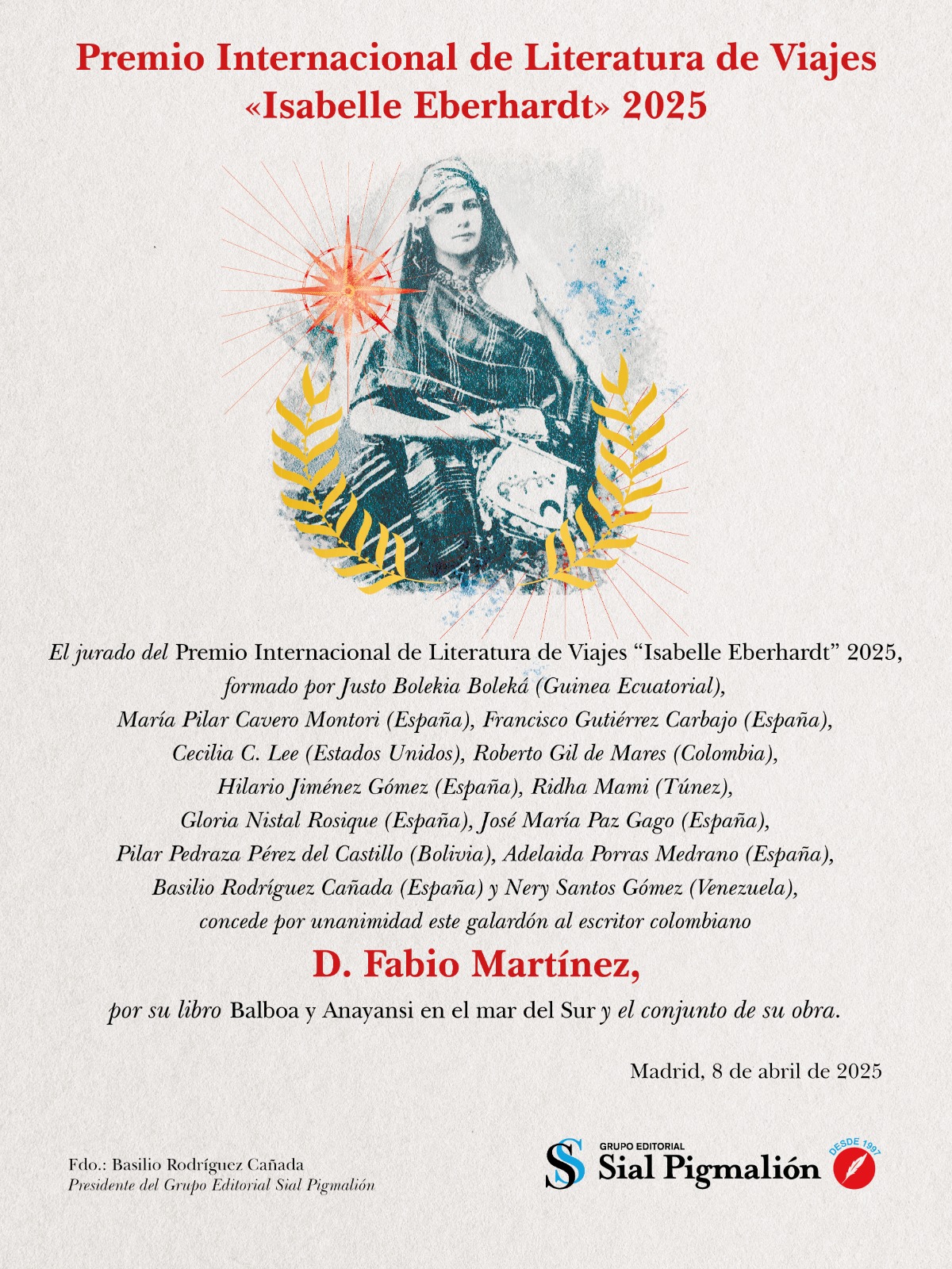 El escritor colombiano Fabio Martínez ha sido distinguido con el Premio Internacional de Literatura de Viajes “Isabelle Eberhardt” 2025, otorgado por el Grupo Editorial Sial Pigmalión, en reconocimiento a su novela Balboa y Anayansi en el mar del Sur y al conjunto de su obra, dedicada a narrar el viaje como experiencia vital, histórica y literaria.