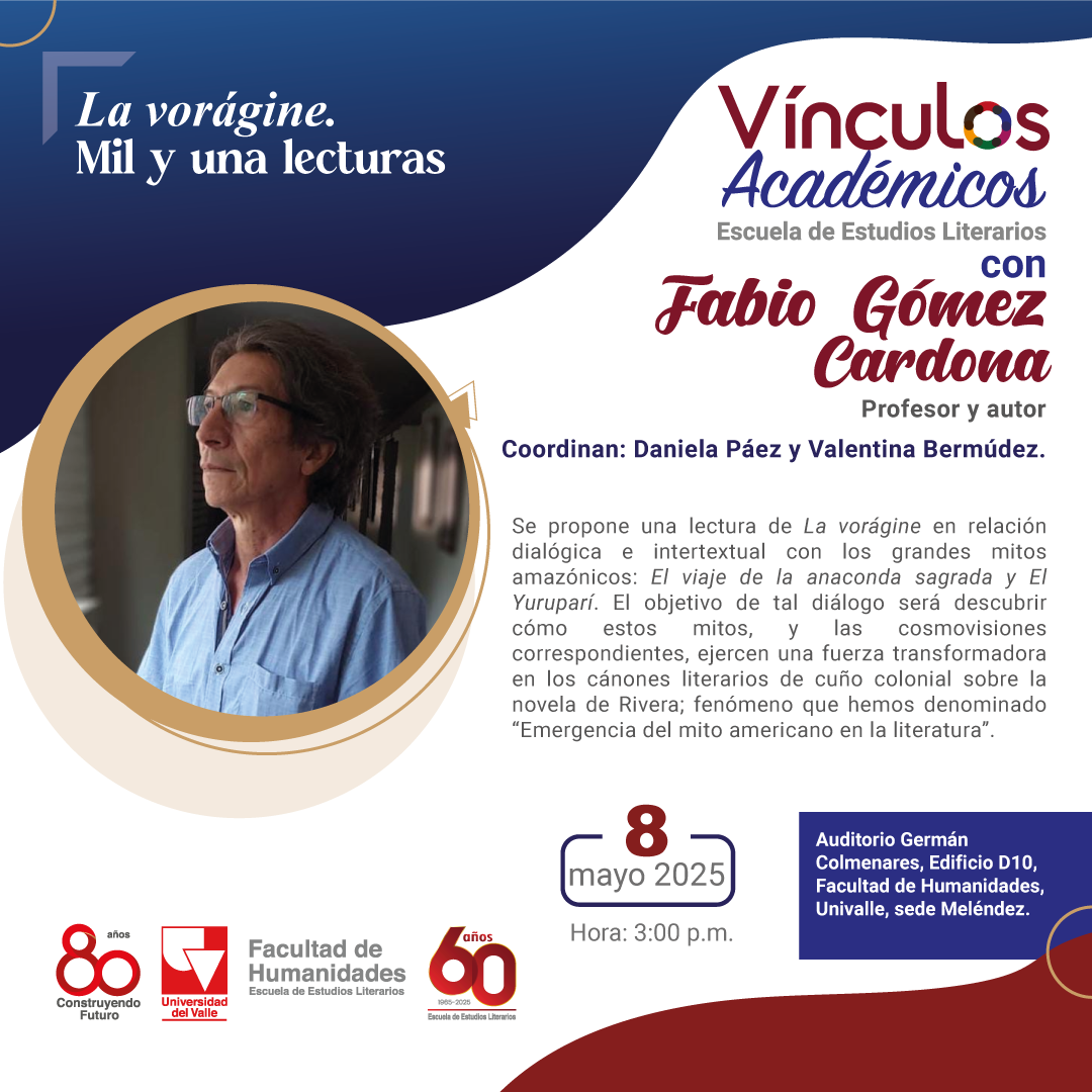 Vínculos Académicos de la Escuela de Estudios Literarios invita a la actividad del jueves 8 de mayo. El invitado es el profesor y escritor Fabio Gómez, quien dictará la conferencia "La vorágine. Mil y una lecturas". Allí, se propone una lectura de La vorágine en relación dialógica e intertextual con los grandes mitos amazónicos: "El viaje de la anaconda sagrada" y "El Yuruparí". El objetivo de tal diálogo será descubrir cómo estos mitos y las cosmovisiones correspondientes ejercen una fuerza transformadora en los cánones literarios de cuño colonial sobre la novela de Rivera; fenómeno que hemos denominado "Emergencia del mito americano en la literatura".