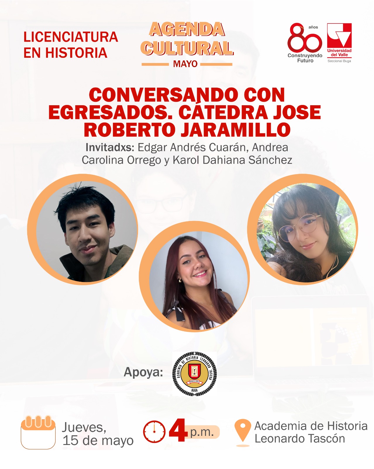 La Licenciatura en Historia (sede Buga) de la Facultad de Humanidades invita a la actividad "Conversando con egresados. Cátedra José Roberto Jaramillo". Los egresados invitados son Edgar Andrés Cuarán, Andrea Carolina Orrego y Karol Dahiana Sánchez. La actividad se realizará el jueves 15 de mayo, a las 4:00 p.m., en la Academia de Historia Leonardo Tascón (sede Buga).