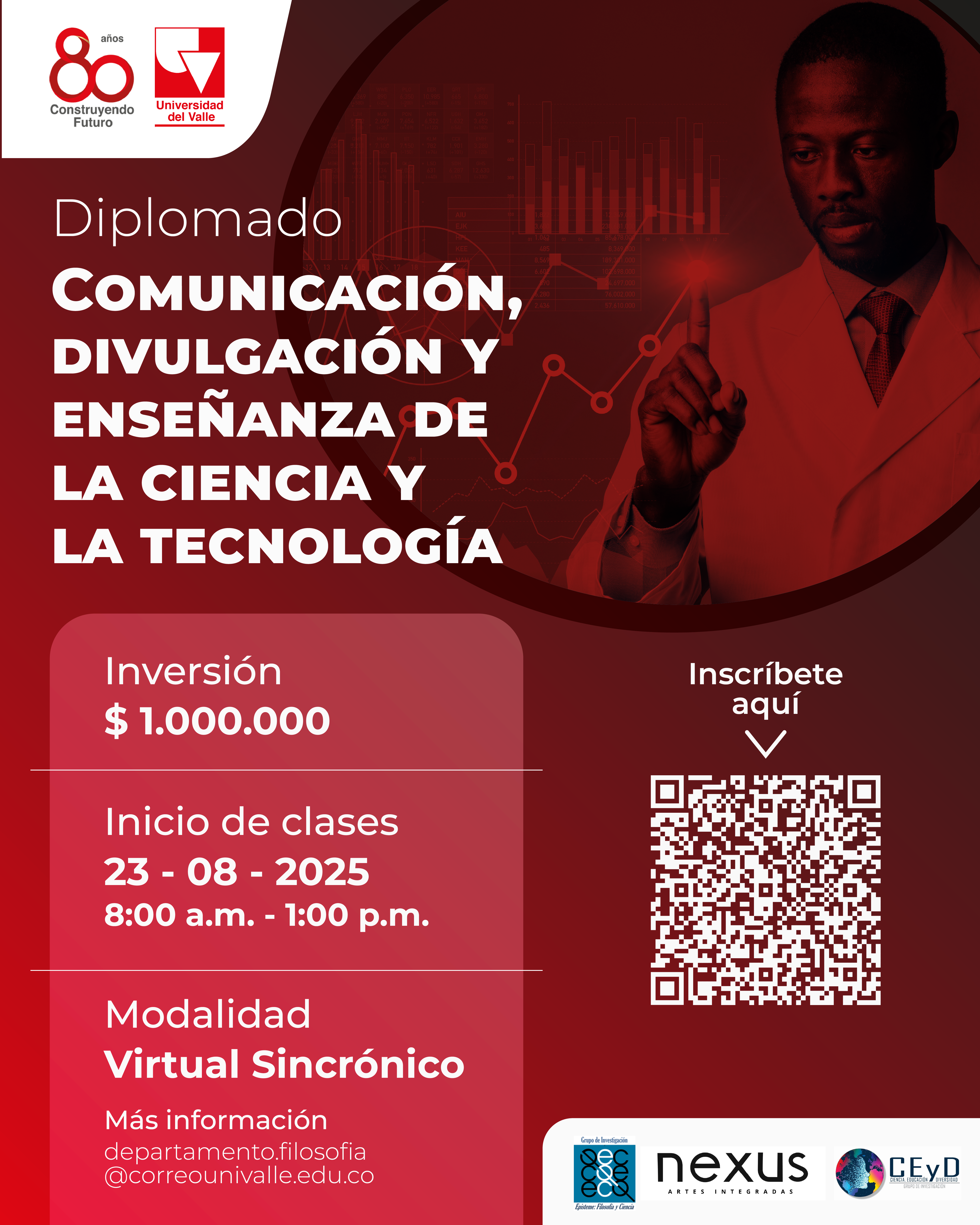 La Facultad de Humanidades de la Universidad del Valle se complace en anunciar que, mediante la Resolución No. 082 del 2 de abril de 2025, fue aprobado el Diplomado en Comunicación, Divulgación y Enseñanza de la Ciencia y la Tecnología, una iniciativa del Departamento de Filosofía, en alianza con el Grupo de Investigación CEyD y NEXUS Artes Integradas.
