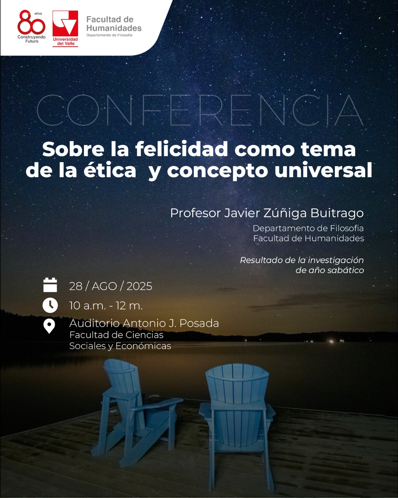El Departamento de Filosofía de la Facultad de Humanidades tiene el gusto de invitarlos a la conferencia Sobre la felicidad como tema de la ética y concepto universal. La conferencia hace parte del resultado de la investigación realizada por el profesor Javier Zúñiga Buitrago durante su año sabático. Javier Zúñiga es doctor en filosofía de la Université d´Ottawa, Canada y magíster en filosofía por la Universidad del Valle.