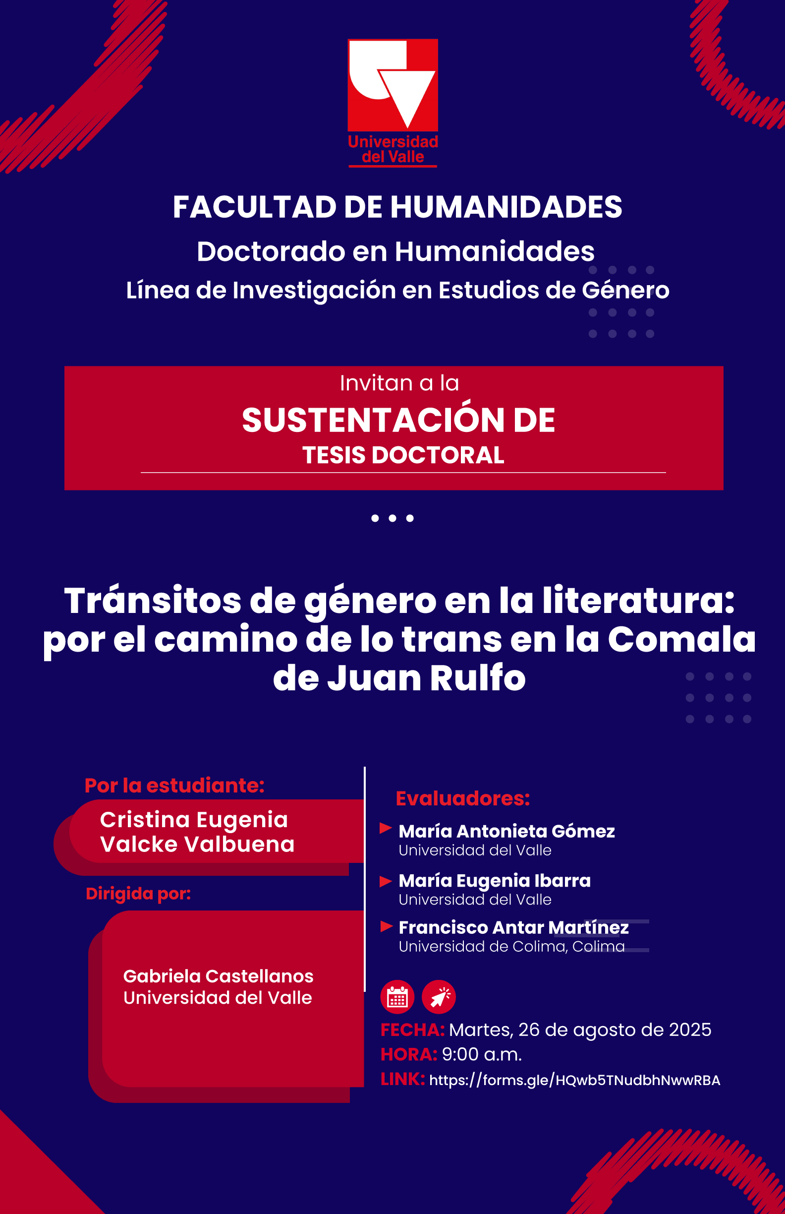 El Doctorado en Humanidades de la Facultad de Humanidades, en su Línea de Investigación en Estudios de Género, invitan a la sustentación de la tesis doctoral "Tránsitos de género en la literatura: por el camino de lo trans en la Comala de Juan Rulfo", realizada por Cristina Eugenia Valcke Valbuena. La directora de la tesis es la profesora Gabriela Castellanos. La actividad se realizará el martes 26 de agosto de 2025, a las 9:00 a.m. El espacio es hibrido- presencial. Físicamente se realizará en el Consejo de la Facultad de Humanidades, edificio D-8. Para solicitar el enlace Meet diligenciar el formulario https://