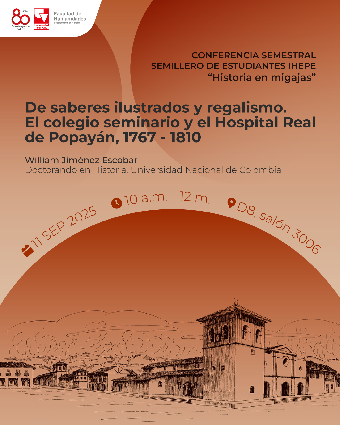 El Seminario de Estudiantes IHEPE "Historia en migajas" del Departamento de Historia de la Facultad de Humanidades invita a la conferencia "De saberes ilustrados y regalismo. El Colegio Seminario y el Hospital Real de Popayán, 1767 - 1810" a cargo del doctorando William Jiménez Escobar (Universidad Nacional de Colombia).