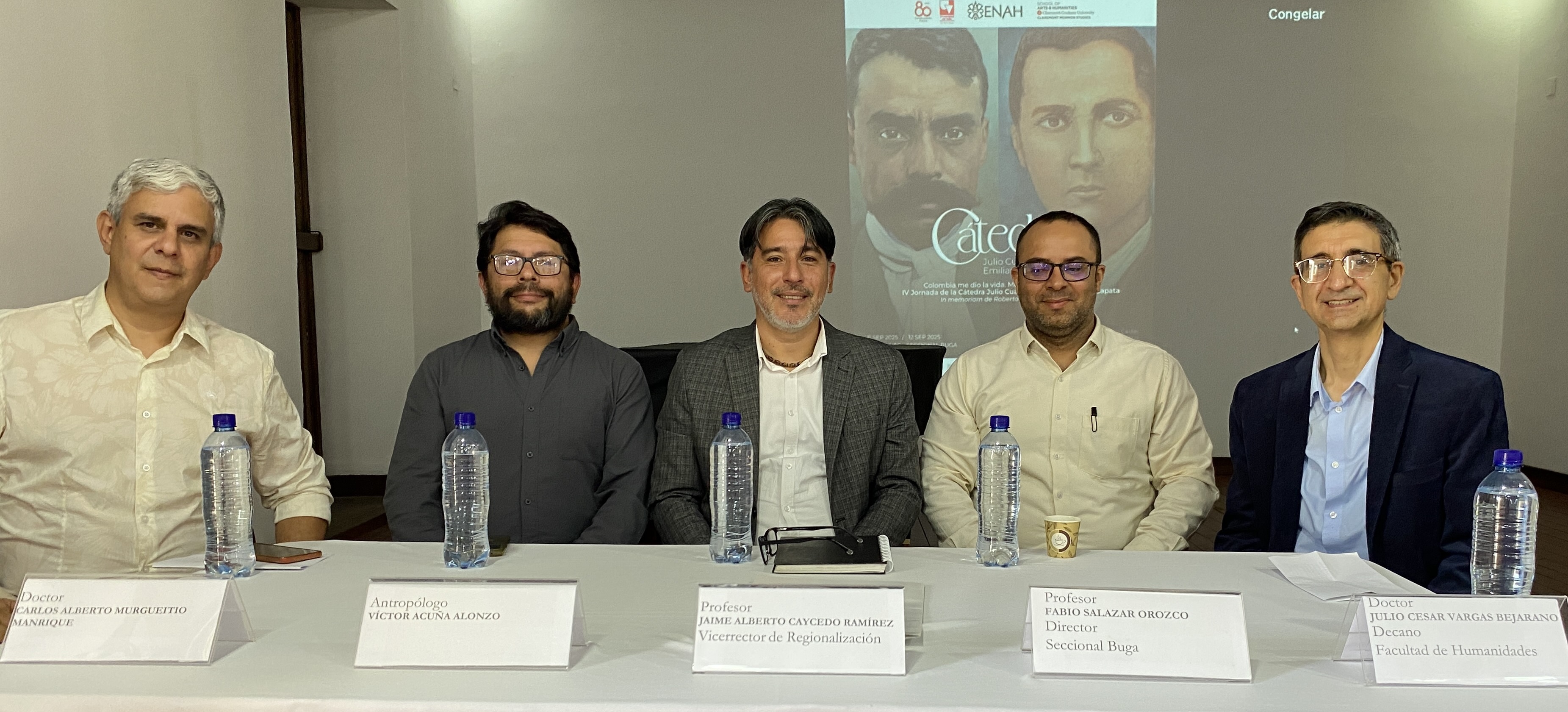 La mesa de honor del acto de firma de este convenio estuvo conformada por los profesores Jaime Alberto Caycedo Ramírez, vicerrector de Regionalización, en representación del rector de la Universidad del Valle; Víctor Acuña Alonso, director de la Escuela Nacional de Antropología e Historia -ENAH- de México; Julio César Vargas Bejarano, decano de la Facultad de Humanidades; Fabio Salazar Orozco, director de la sede Buga, y Carlos Alberto Murgueitio Manrique, director del Departamento de Historia.