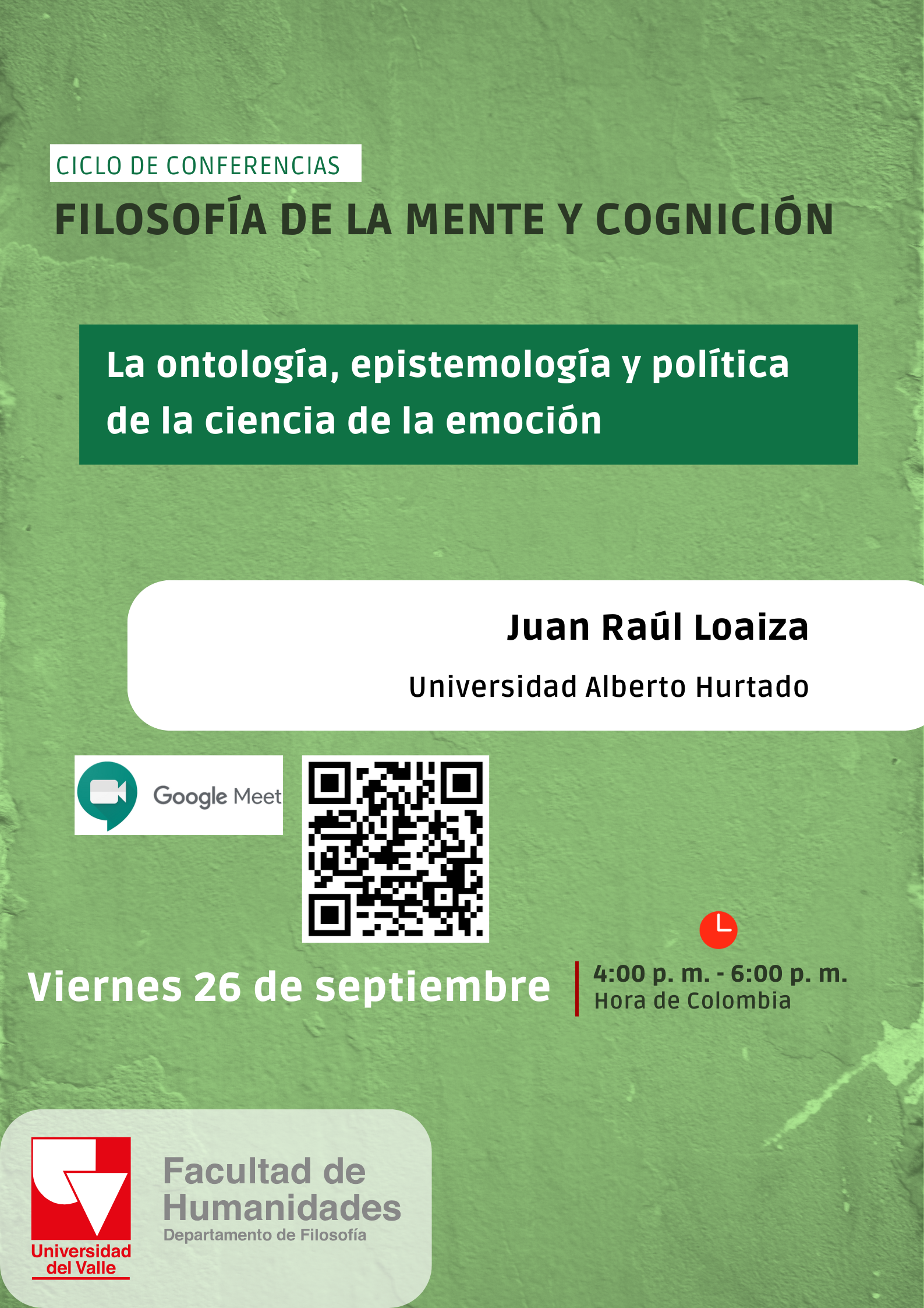 En esta ocasión, el conferencista será el Dr. Juan Raúl Loaiza de la Universidad Alberto Hurtado, Chile. El título de su conferencia es «La ontología, epistemología y política de la ciencia de la emoción». Abajo encontrarán el resumen.