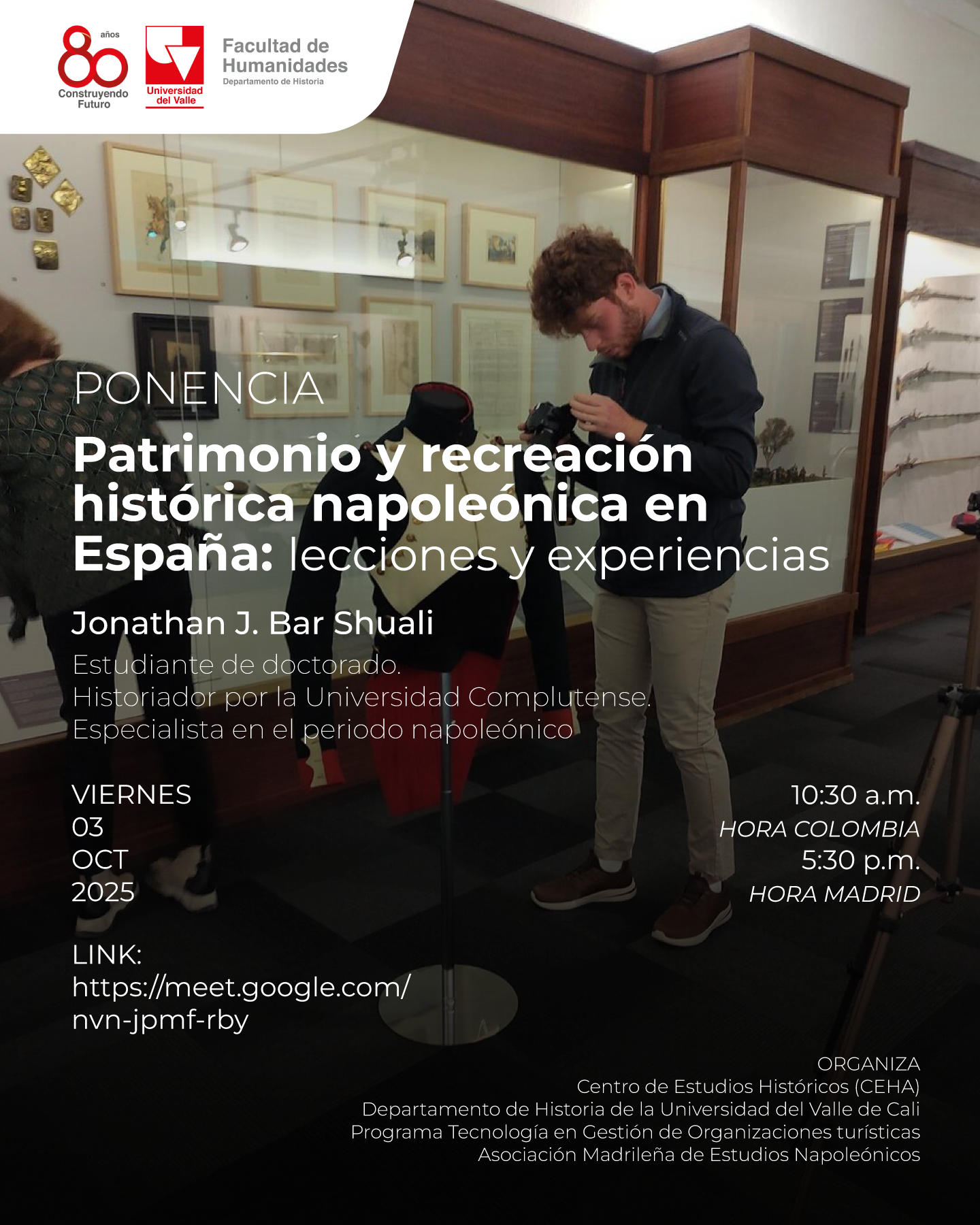 El Centro de Estudios Históricos y Ambientales (CEHA) junto al Departamento de Historia de la Universidad del Valle de Cali y la seccional Buga, L'Aigle (Revista Científica para el Estudio de la Revolución y el Imperio) y el programa Tecnología en Gestión de Organizaciones Turísticas, extiende una cordial invitación al Encuentro: "Patrimonio y recreación histórica napoleónica en España: lecciones y experiencias" a Cargo del investigador estudiante de doctorado Jonathan Jacobo Bar Shuali. Graduado en Historia por la Universidad Complutense de Madrid, especialista en el periodo napoleónico. Miembro y presidente de la Asociación Napoleónica Fusiliers-Chasseurs Madrid. Presenta y modera el estudiante Juan Camilo Pérez Martínez.