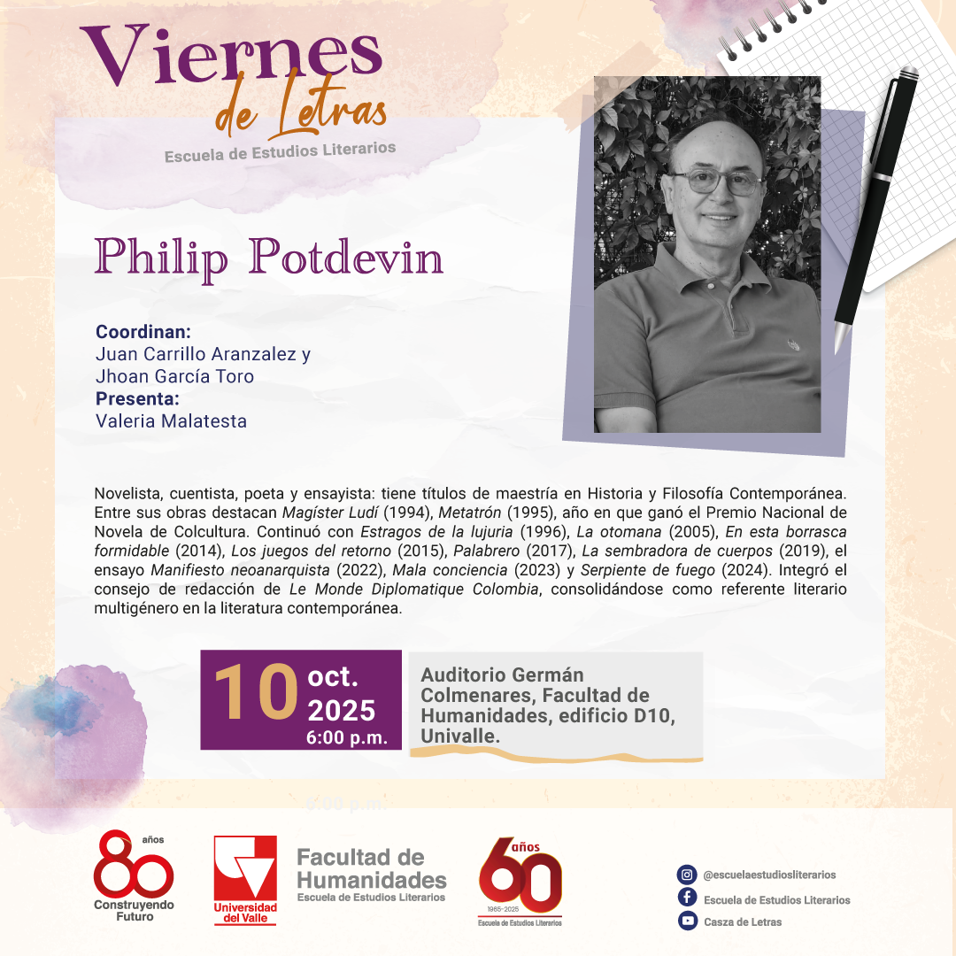 Viernes de Letras, espacio académico y cultural de la Escuela de Estudios Literarios, invita a la actividad programada para el próximo viernes 10 de octubre. El invitado será el novelista, cuentista, poeta y ensayista Philip Potdevin. La cita es en el Auditorio Germán Colmenares, Facultad de Humanidades, Edificio D 10.