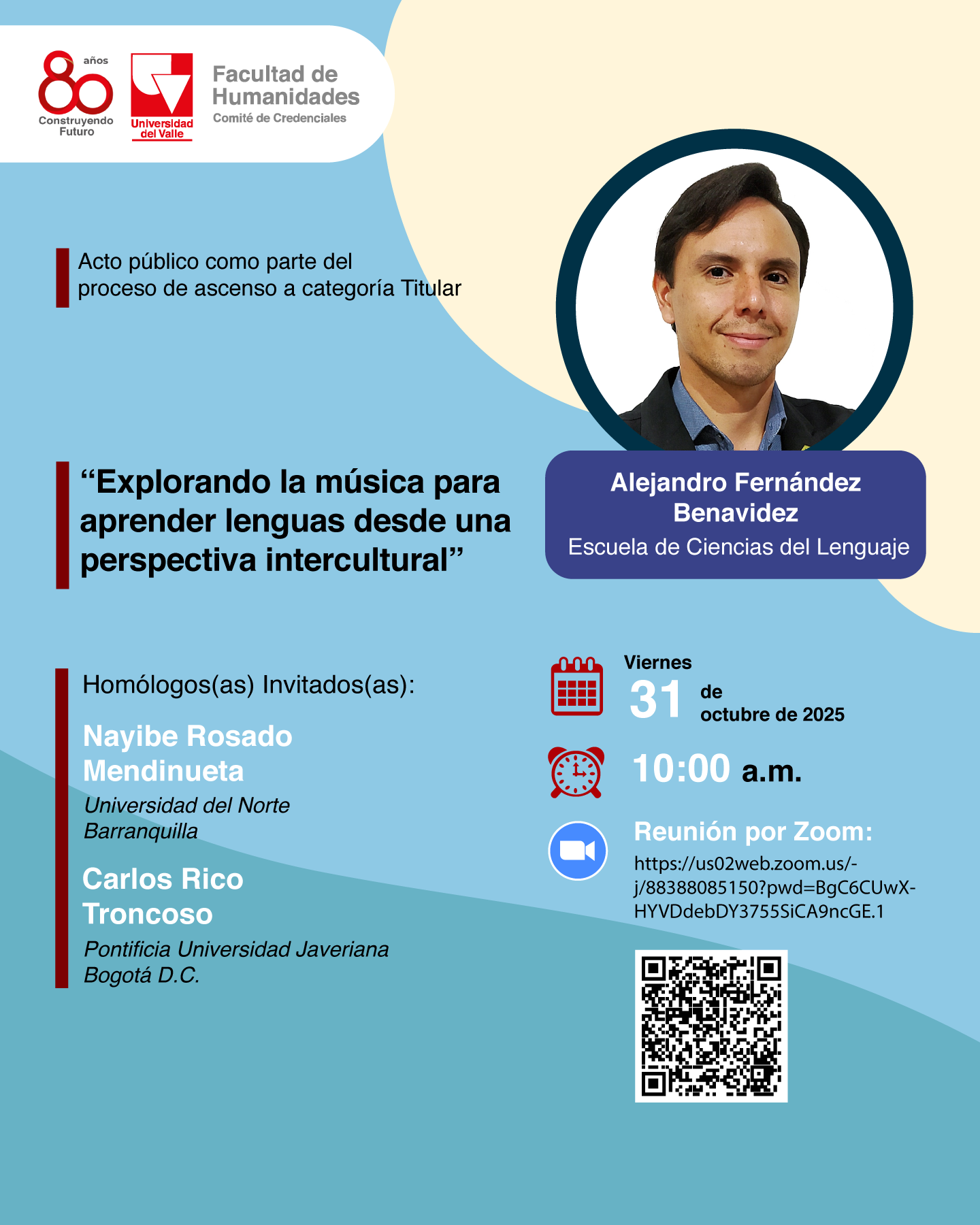 El Comité de Credenciales de la Facultad de Humanidades invita al acto público como parte del proceso de ascenso a categoría titular del profesor Alejandro Fernández Benavidez de la Escuela de Ciencias del Lenguaje. El tema que desarrollará el profesor será "Explorando la música para aprender lenguas desde una perspectiva intercultural". La actividad se realizará el 31 de octubre a las 10:00 a.m.