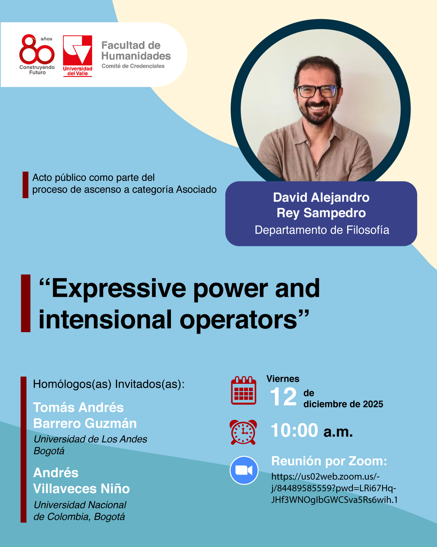 El Comité de Credenciales de la Facultad de Humanidades invita al acto público como parte del proceso de ascenso a categoría Asociado del profesor David Alejandro Rey Sampedro del Departamento de Filosofía de la Facultad de Humanidades. El tema que desarrollará el profesor será "Expressive Power and Intensional Operators" La actividad se realizará el 12 de diciembre de 2025 a las 10:00 a.m.