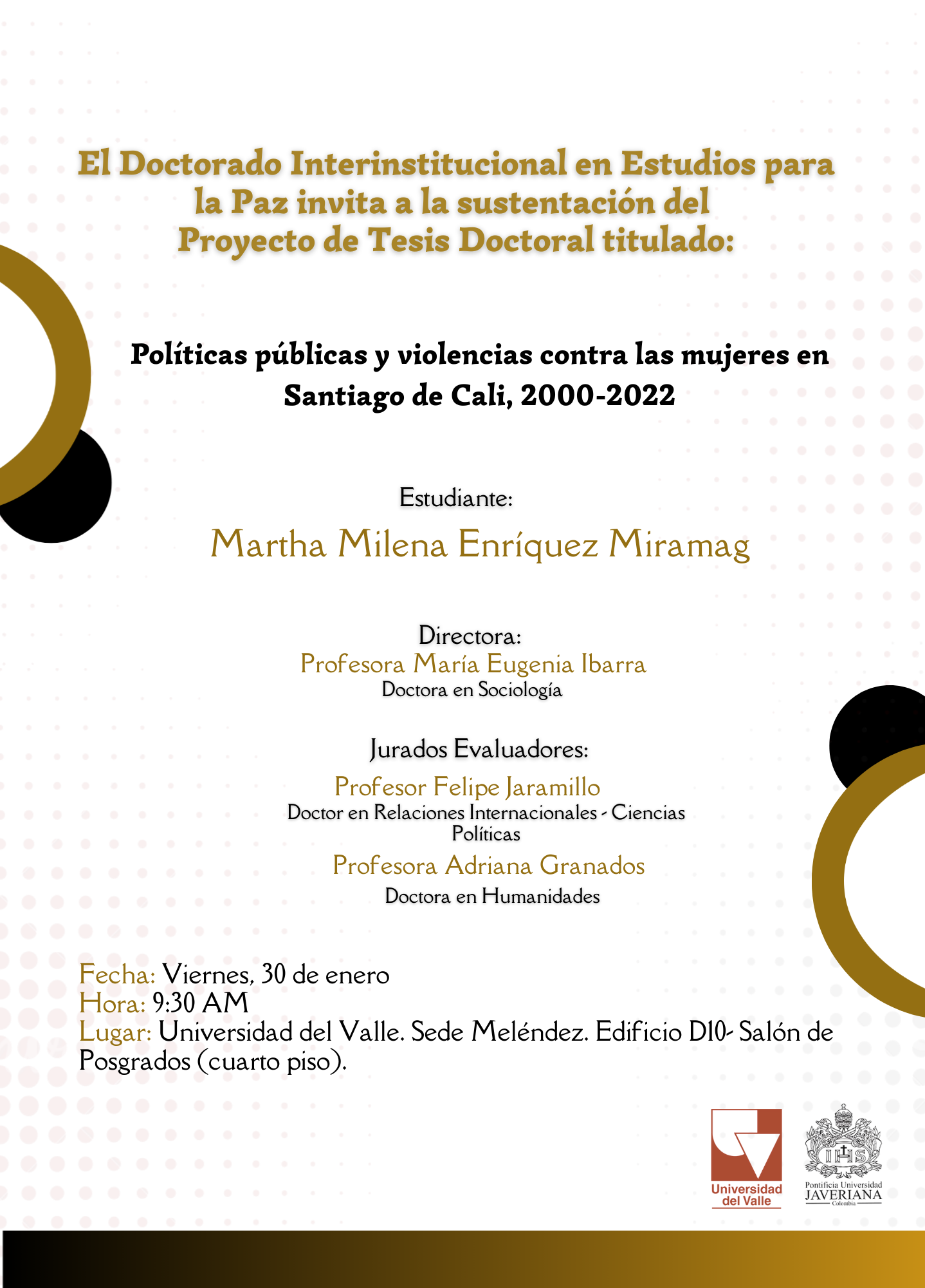 El Doctorado Interinstitucional en Estudios para la Paz anuncia que el próximo 30 de enero se realizará la sustentación de tesis titulada "Políticas públicas y violencias contra las mujeres en Santiago de Cali, 2000-2022". La tesis es el fruto de la investigación realizada por la estudiante Martha Milena Enríquez Miramag. El trabajo es dirigido por la doctora María Eugenia Ibarra. La actividad académica se llevará a cabo en el salón de posgrados del edificio D10, de la sede de Meléndez de la Universidad del Valle, a las 9:30 a.m.