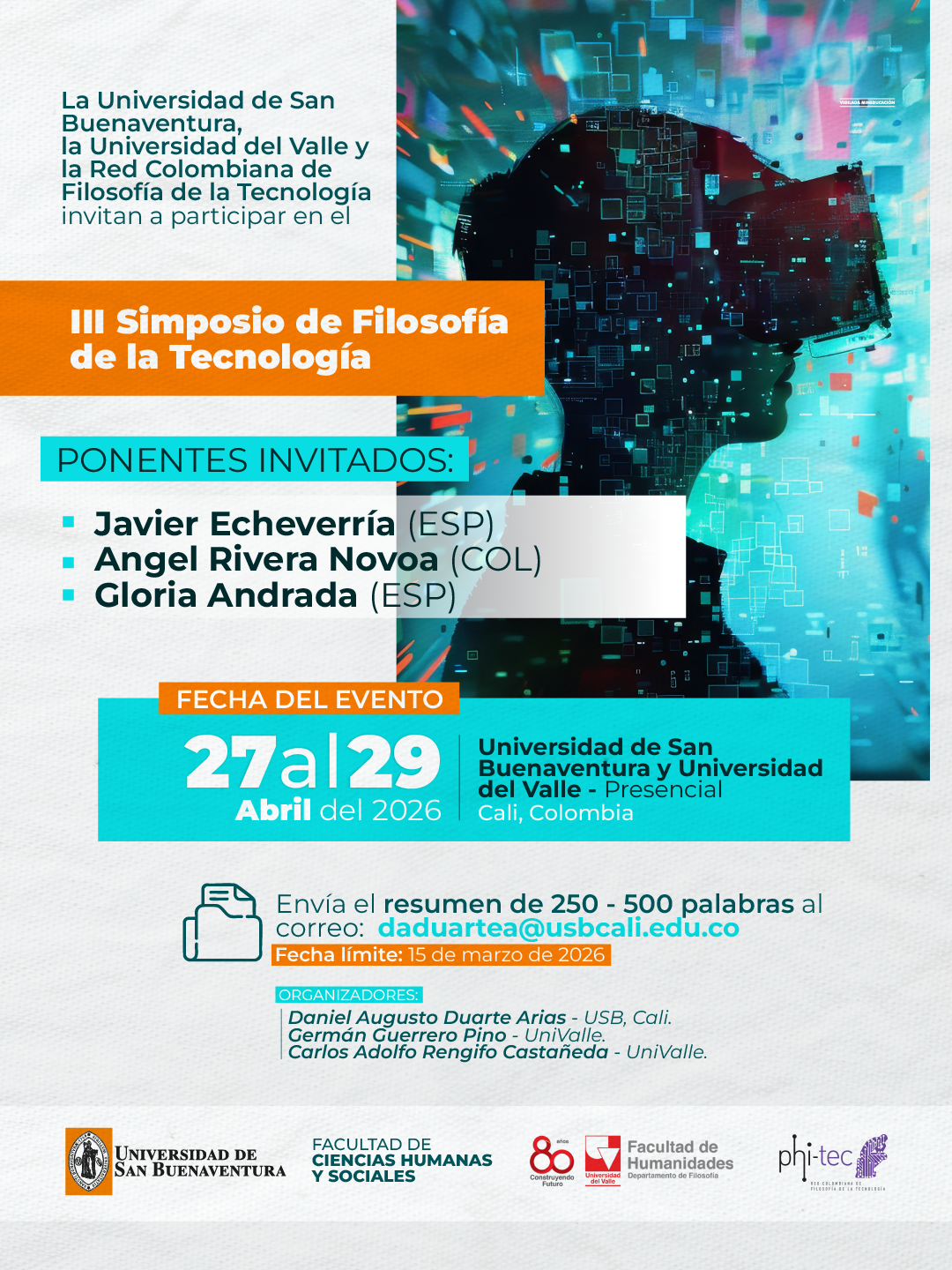 La Universidad del Valle, la Universidad de San Buenaventura y la Red Colombiana de Filosofía de la Tecnología anuncian el III Simposio de Filosofía de la Tecnología. Invitamos a estudiantes de pregrado y posgrado a postular resúmenes de diversas investigaciones relacionadas con tecnología al correo Esta dirección de correo electrónico está siendo protegida contra los robots de spam. Necesita tener JavaScript habilitado para poder verlo..