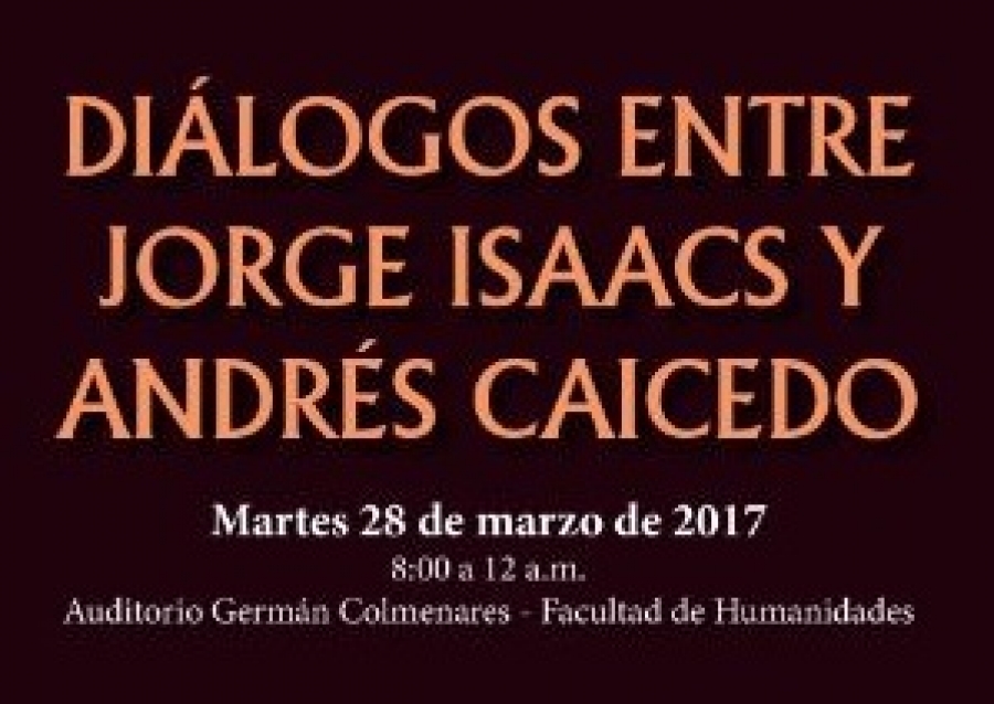 La Facultad de Humanidades de la Escuela de Estudios Literarios con apoyo de la Licenciatura en Literatura y la Universidad Distrital Francisco José de Caldas, invitan a la conferencia "Diálogos entre Jorge Isaacs y Andrés Caicedo" en la que participarán los profesores Fabio Martínez de la Universidad del Valle y el profesor Jorge Eliécer Ordoñez de la Universidad Distrital Francisco José de Caldas.