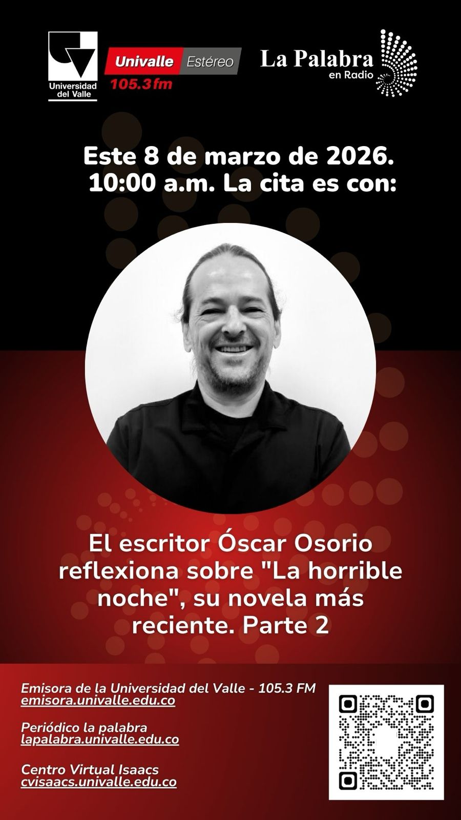 La Palabra y Univalle Estéreo invitan a toda la comunidad a sintonizar la parte 2 de la entrevista con el escritor Óscar Osorio, en la que se reflexionará sobre su novela más reciente "La horrible noche".