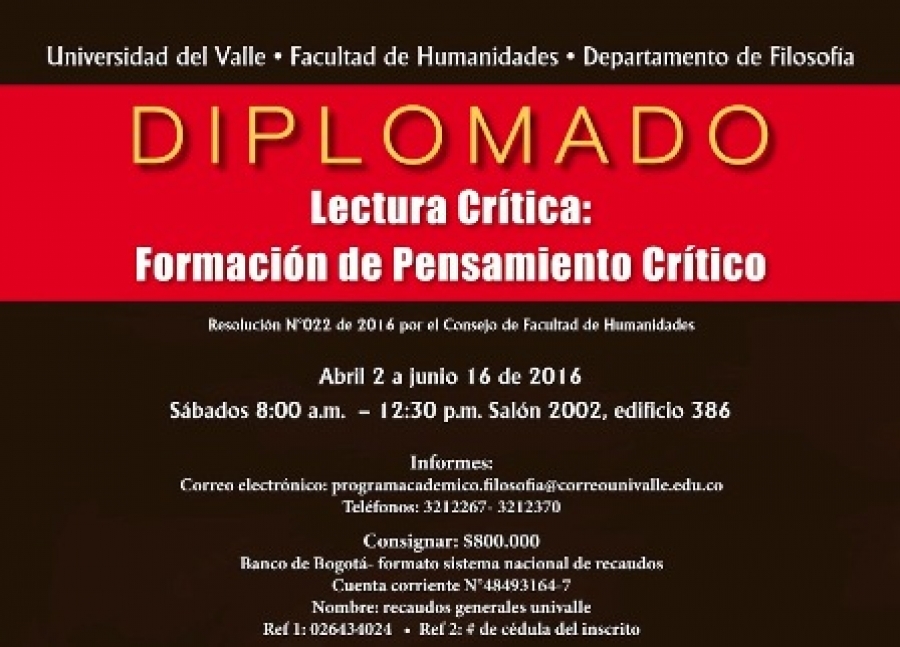 El Departamento de Filosofía abre inscripciones para el diplomado Lectura Crítica: Formación de Pensamiento Crítico, dirigido a docentes de Básica Primaria, Básica Secundaria y Educación Media de las áreas de ciencias sociales, filosofía, lenguaje o ética y valores.