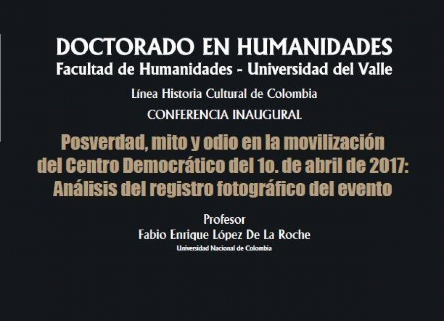 El Doctorado en Humanidades Línea Historia Cultural de Colombia, de la Universidad del Valle, invita a la conferencia inaugural ‘Posverdad, mito y odio en la movilización del Centro Democrático del 1o. de abril de 2017: Análisis del registro fotográfico del evento’, que dictará el profesor Fabio Enrique López De La Roche, de la Universidad Nacional de Colombia, este jueves 7 de septiembre, a las 5:00 p.m., en el auditorio Germán Colmenares, Univalle, Meléndez.
