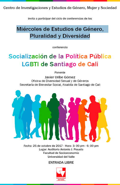 Les invitamos a participar de la conferencia "Socialización de la Política Pública LGBTI de Santiago de Cali", en el marco del ciclo de conferencias de los Miércoles de Estudios de Género, Pluralidad y Diversidad, organizado por el Centro de Investigaciones y Estudios de Género, Mujer y Sociedad de la Universidad del Valle. El ponente invitado, Javier Uribe Gómez, es representante de la Oficina de Diversidad Sexual y de Géneros de la Secretaría de Bienestar Social de la Alcaldía de Santiago de Cali.