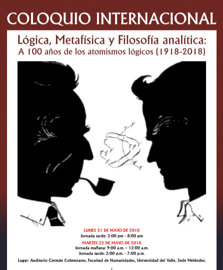 El Departamento de Filosofía de la Universidad del Valle invita al Coloquio Internacional Lógica, Metafísica y Filosofía analítica: A 100 años de los atomismos lógicos (1918-2018), que se llevará a cabo entre el 21 y 22 de mayo de 2018, en el Auditorio Germán Colmenares de la Facultad de Humanidades, Univalle, Sede Meléndez.